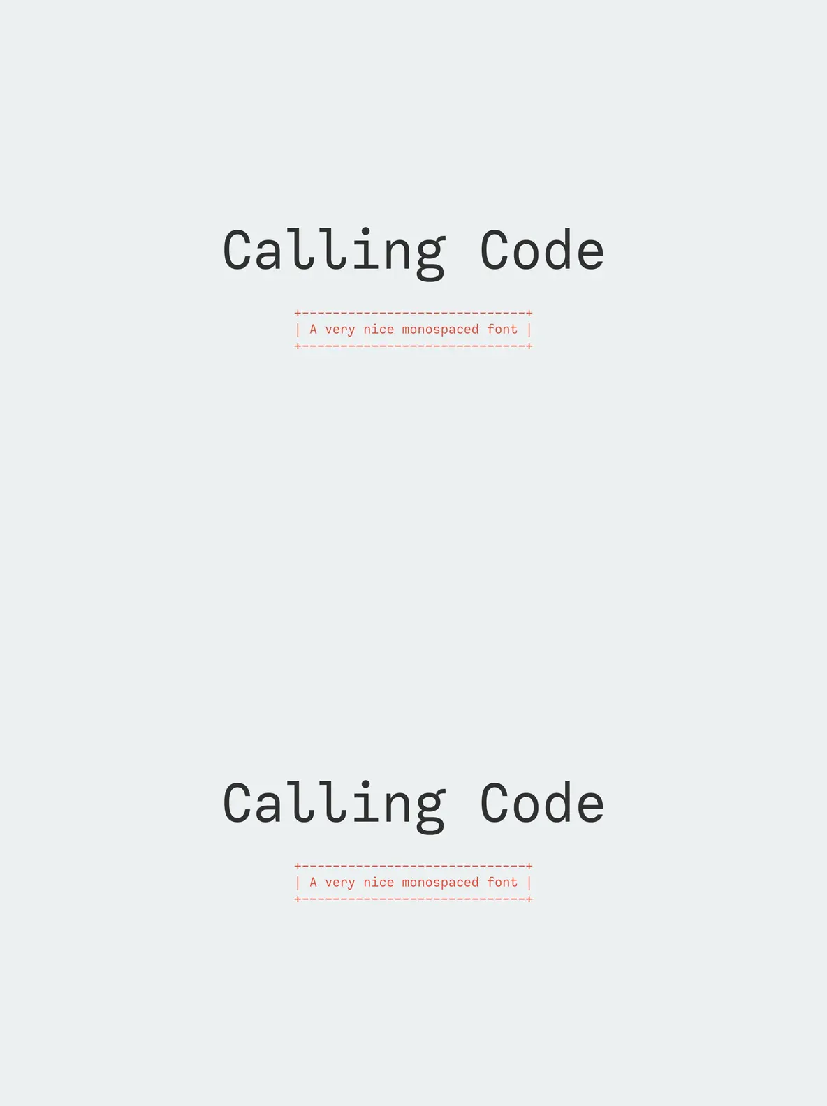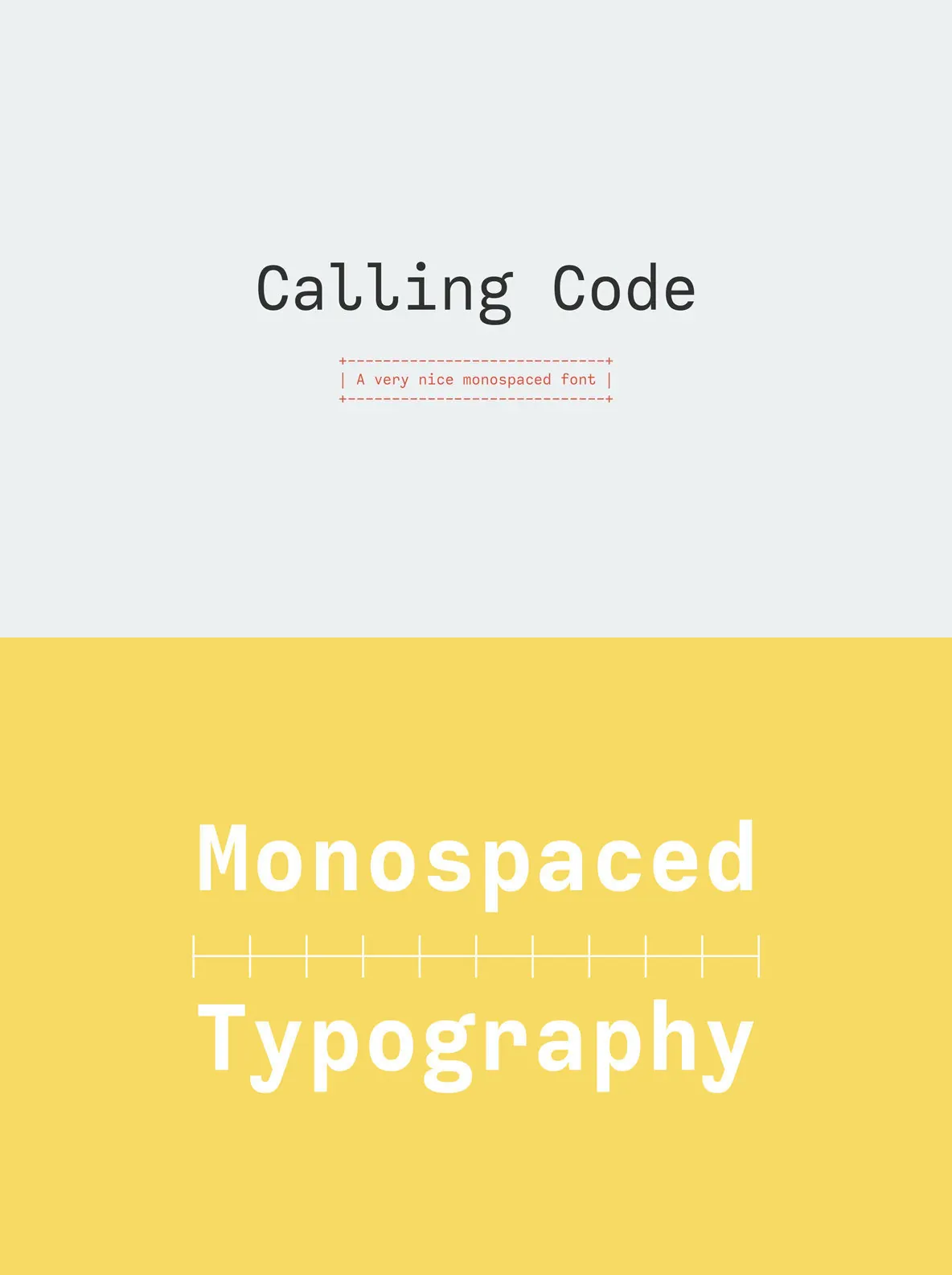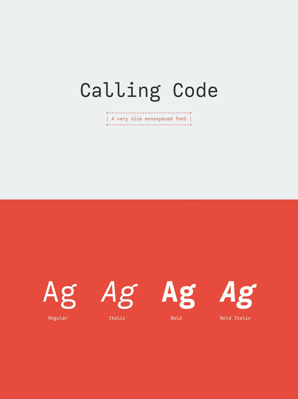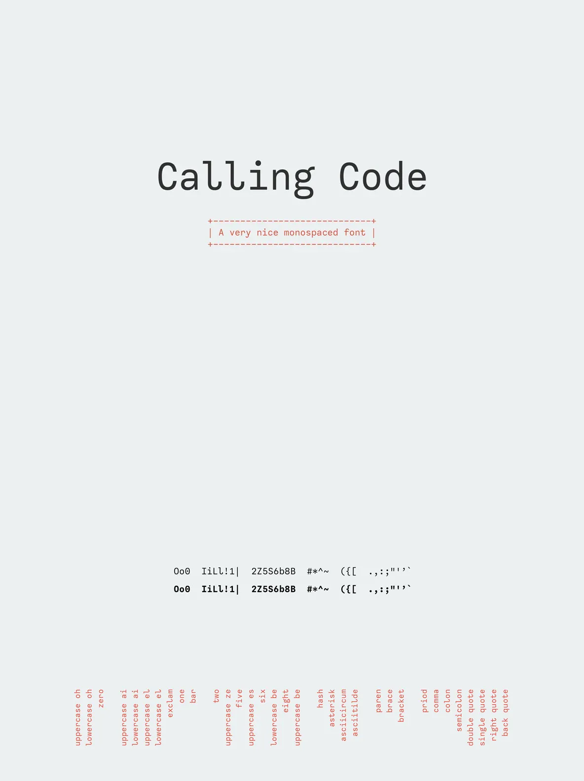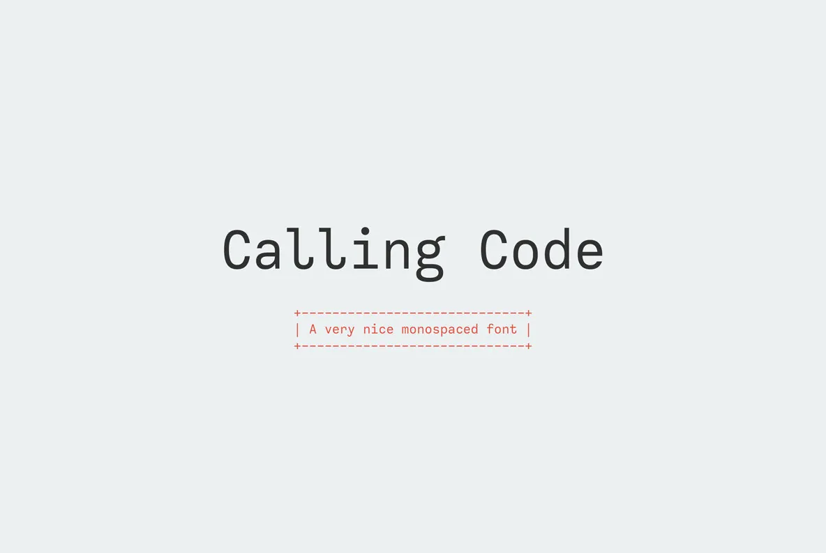 Calling Code is a thoughtfully constructed monospace font family, tailored for both developers and designers who value clarity and precision. This typeface integrates a clean, efficient structure that supports detailed coding workflows and tabular layouts. Its slightly condensed silhouette maximizes screen real estate, while its charming curly tails and clear letterforms ensure unmistakable visual distinction among characters—a trait essential for programming environments.