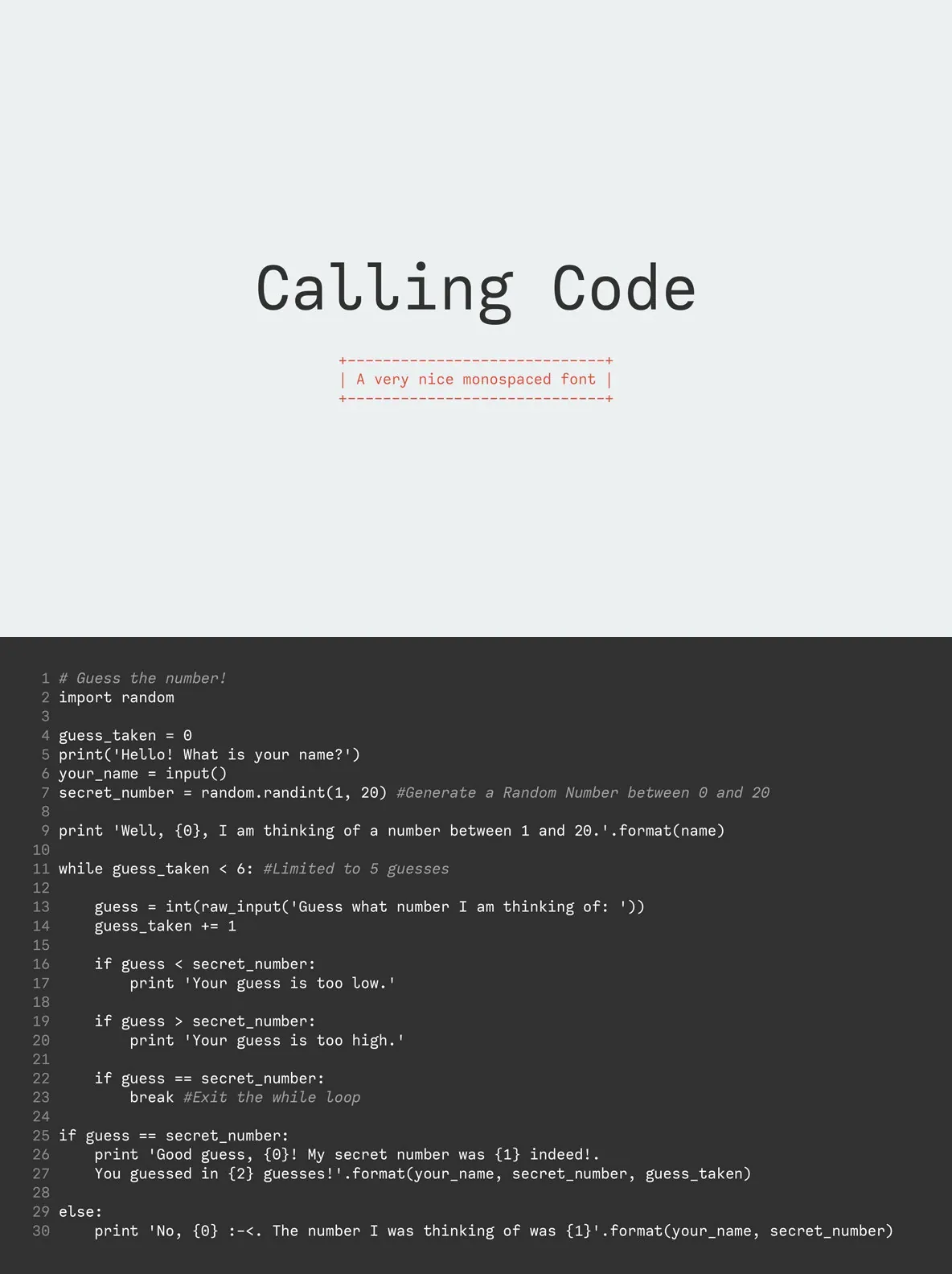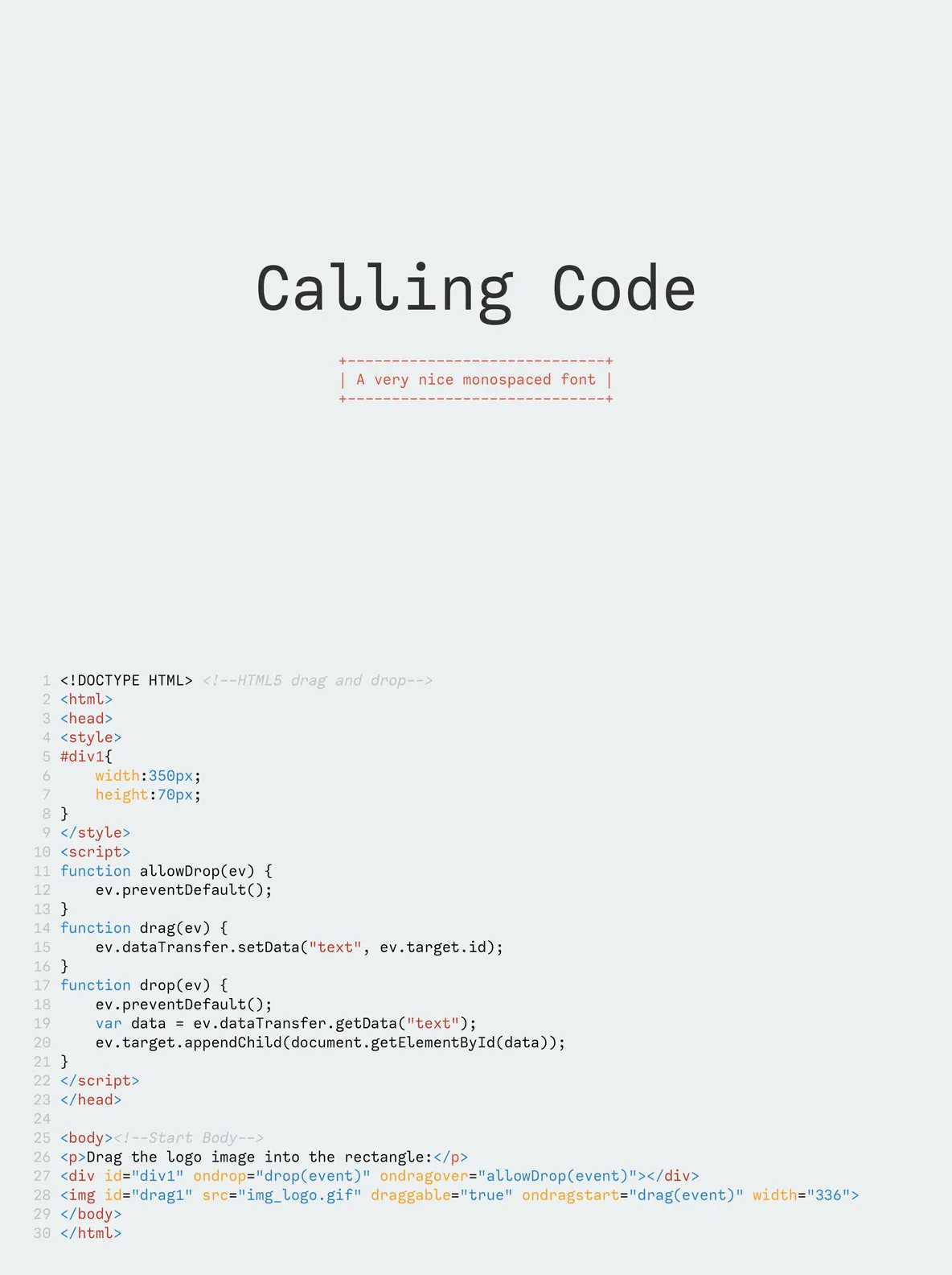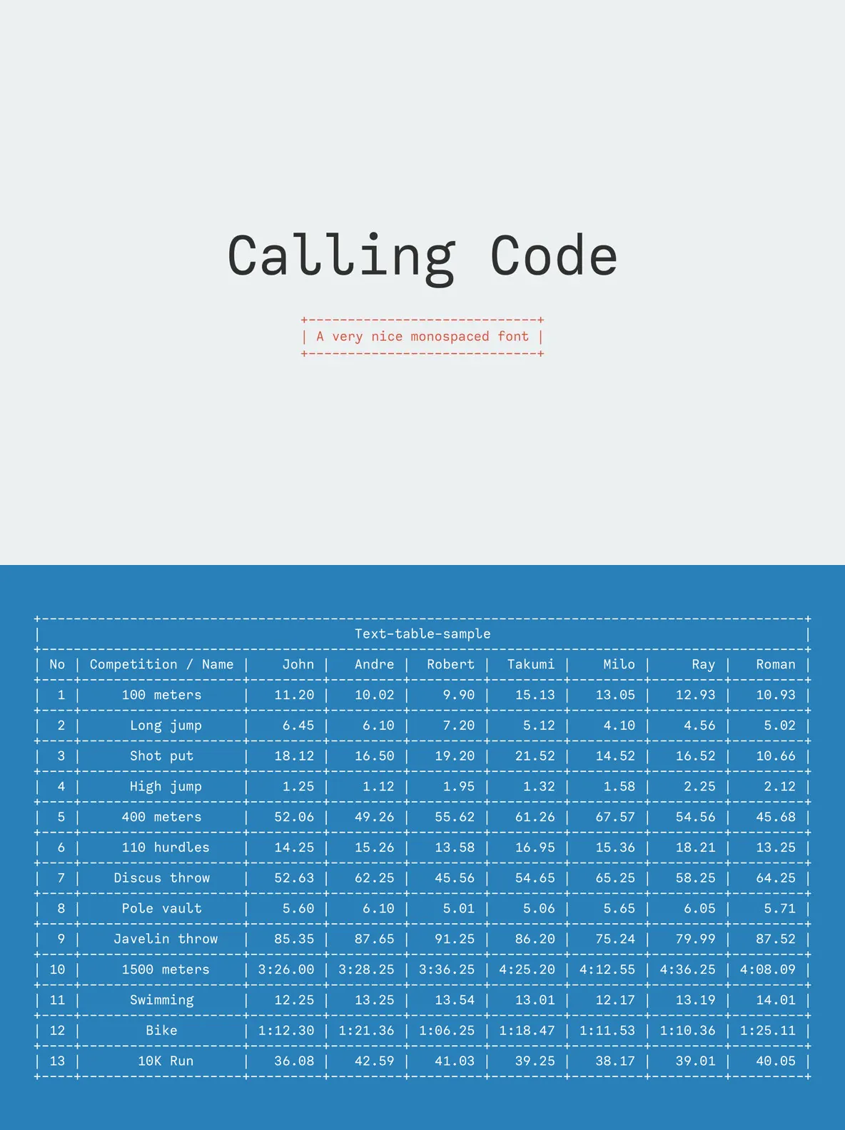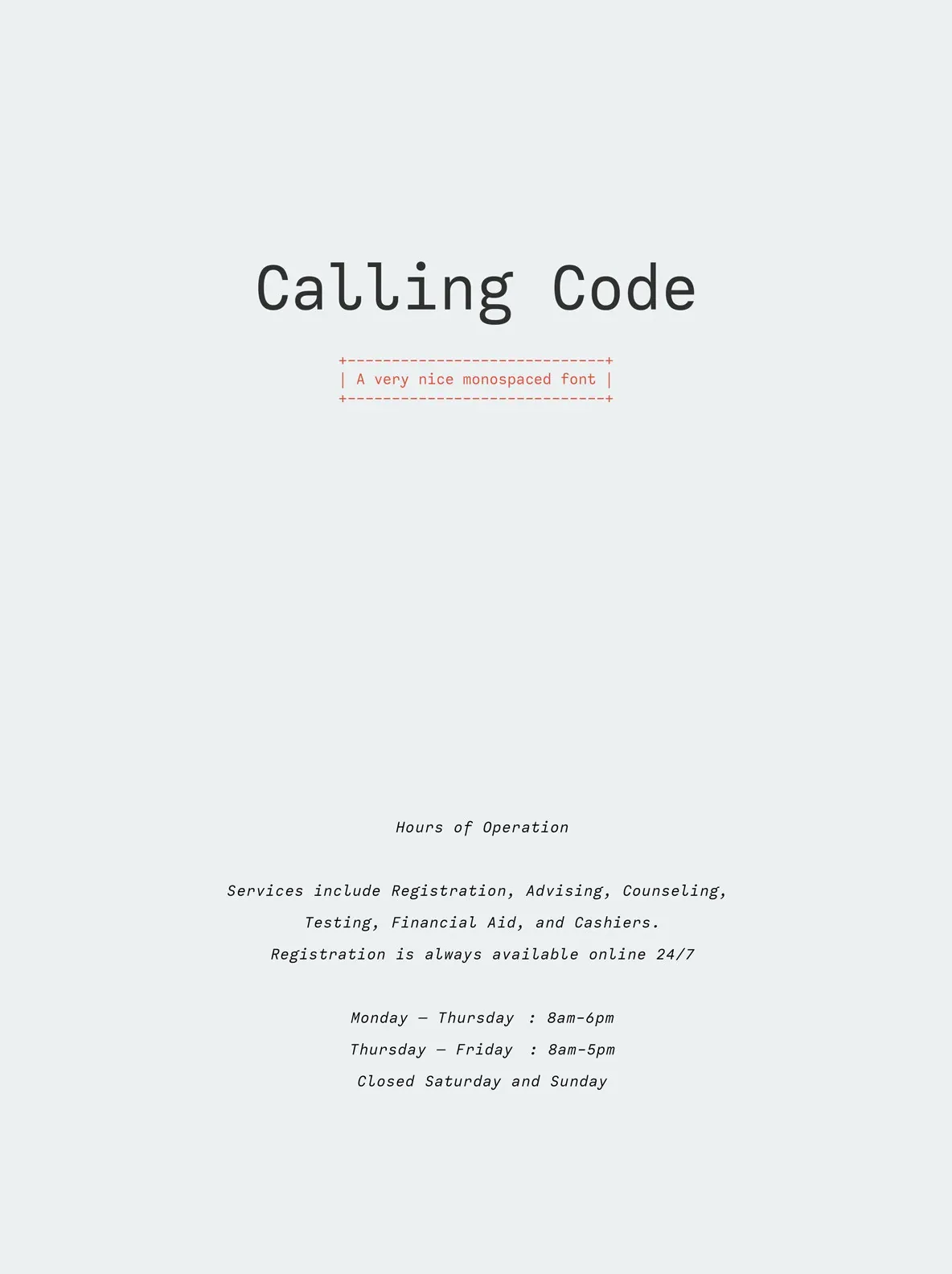 Calling Code is a thoughtfully constructed monospace font family, tailored for both developers and designers who value clarity and precision. This typeface integrates a clean, efficient structure that supports detailed coding workflows and tabular layouts. Its slightly condensed silhouette maximizes screen real estate, while its charming curly tails and clear letterforms ensure unmistakable visual distinction among characters—a trait essential for programming environments.