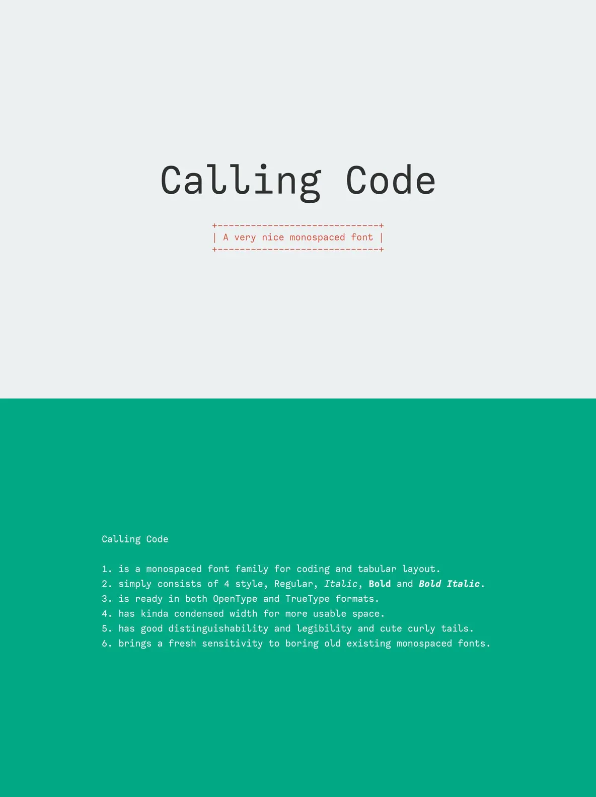 Whether used in code editors, technical documents, or contemporary design applications, Calling Code maintains both functionality and aesthetic appeal. The range of four styles—Regular, Italic, Bold, and Bold Italic—offers flexibility for diverse typographic hierarchies. The Regular style trial version allows for practical testing, giving users firsthand experience with its crisp execution and modern sensibility. As a fresh alternative to traditional coding fonts, Calling Code stands out for those pursuing efficiency without sacrificing design integrity.