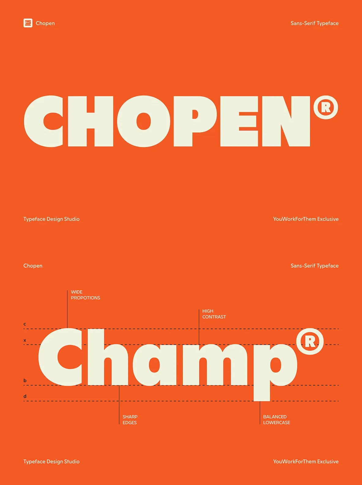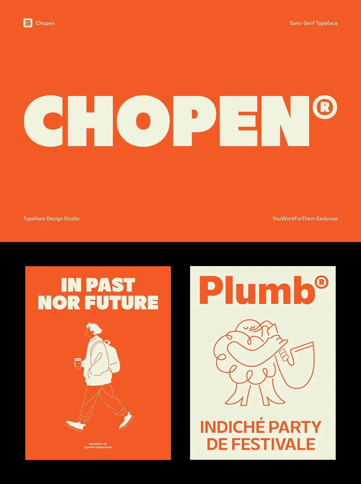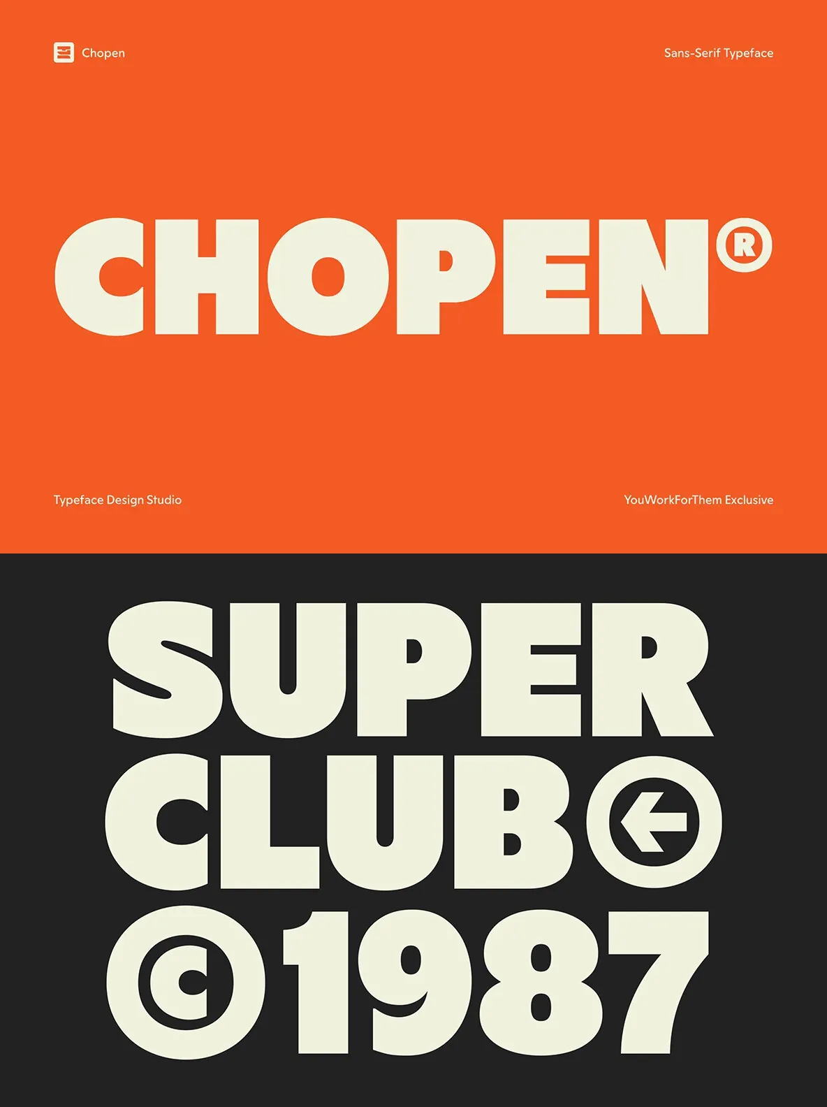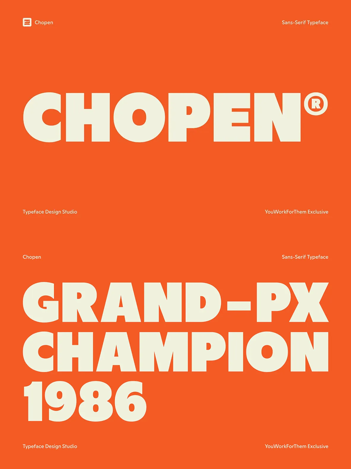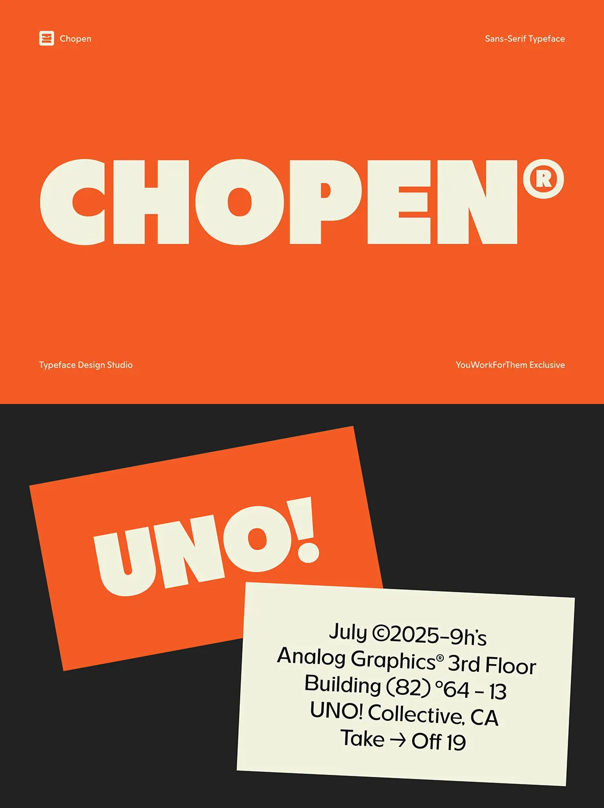 Chopen is a geometric sans-serif font that channels the distinctive visual rhythms of the 1980s but brings them forward with present-day minimalism. Balanced proportions and precise construction define its character, granting readability across digital and print environments. This typeface fits seamlessly into interface design, branding initiatives, and contemporary identity systems, where clarity and sophistication are vital.