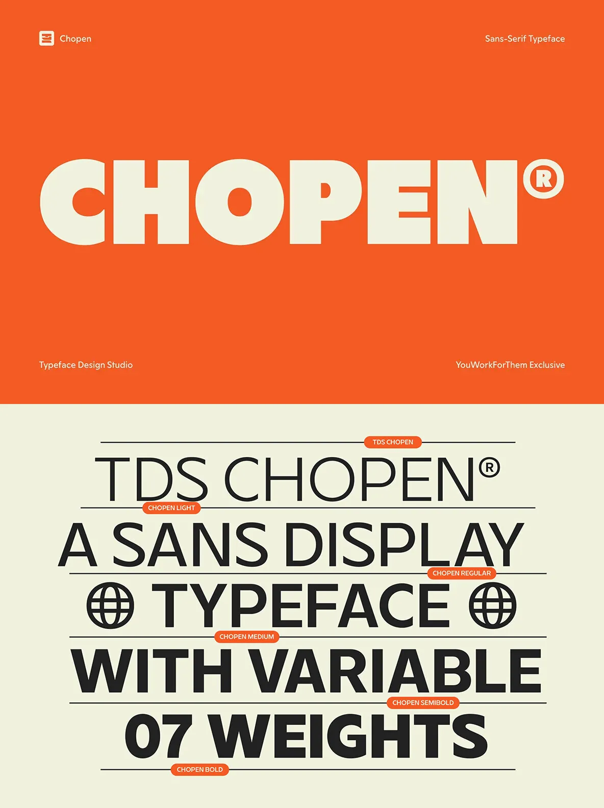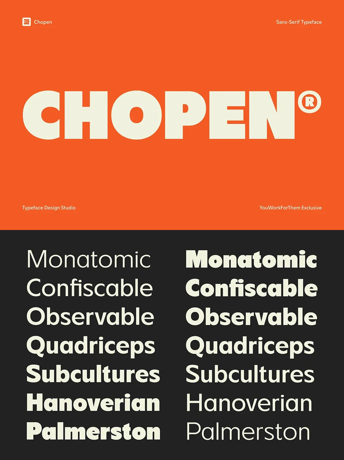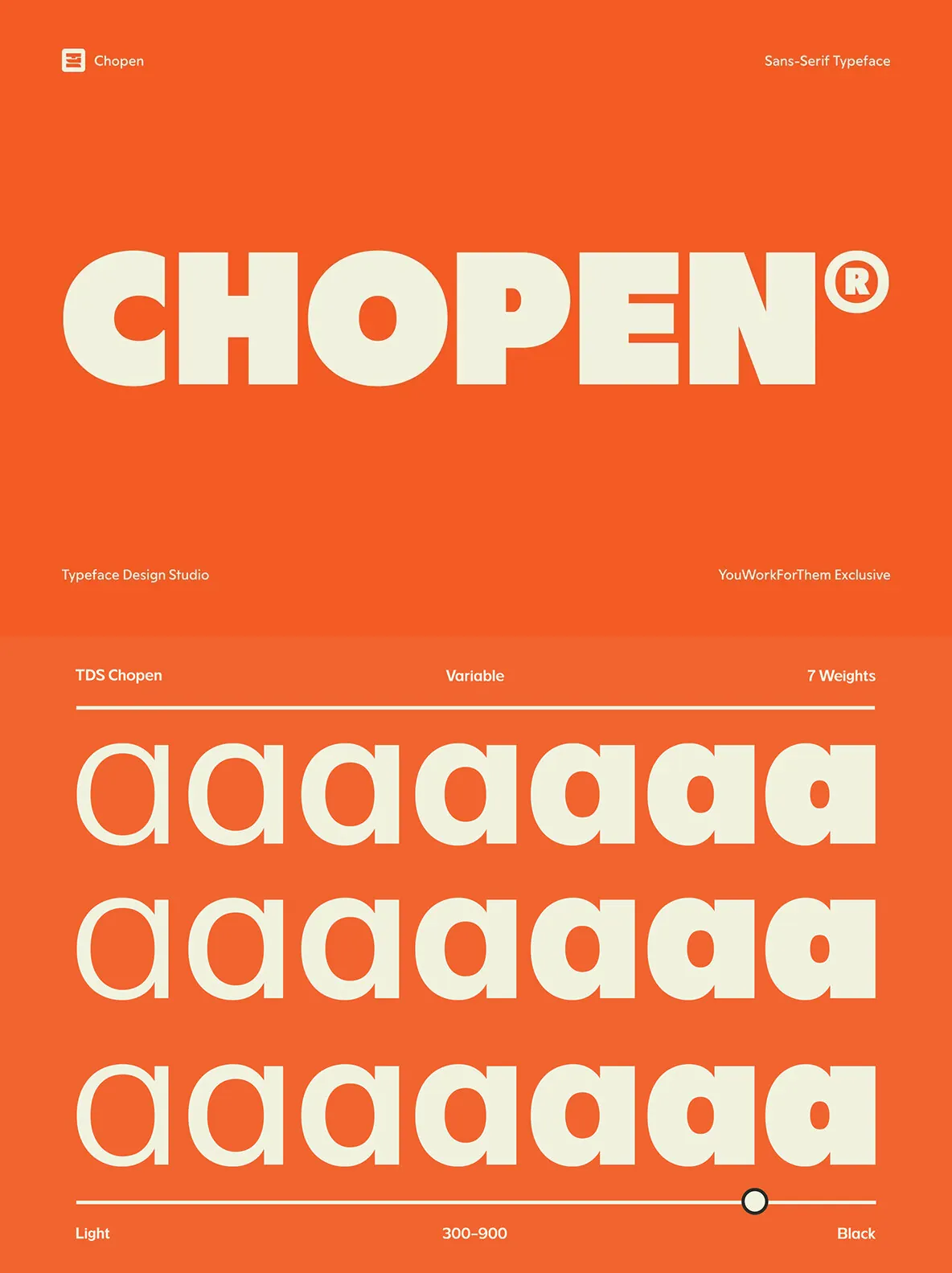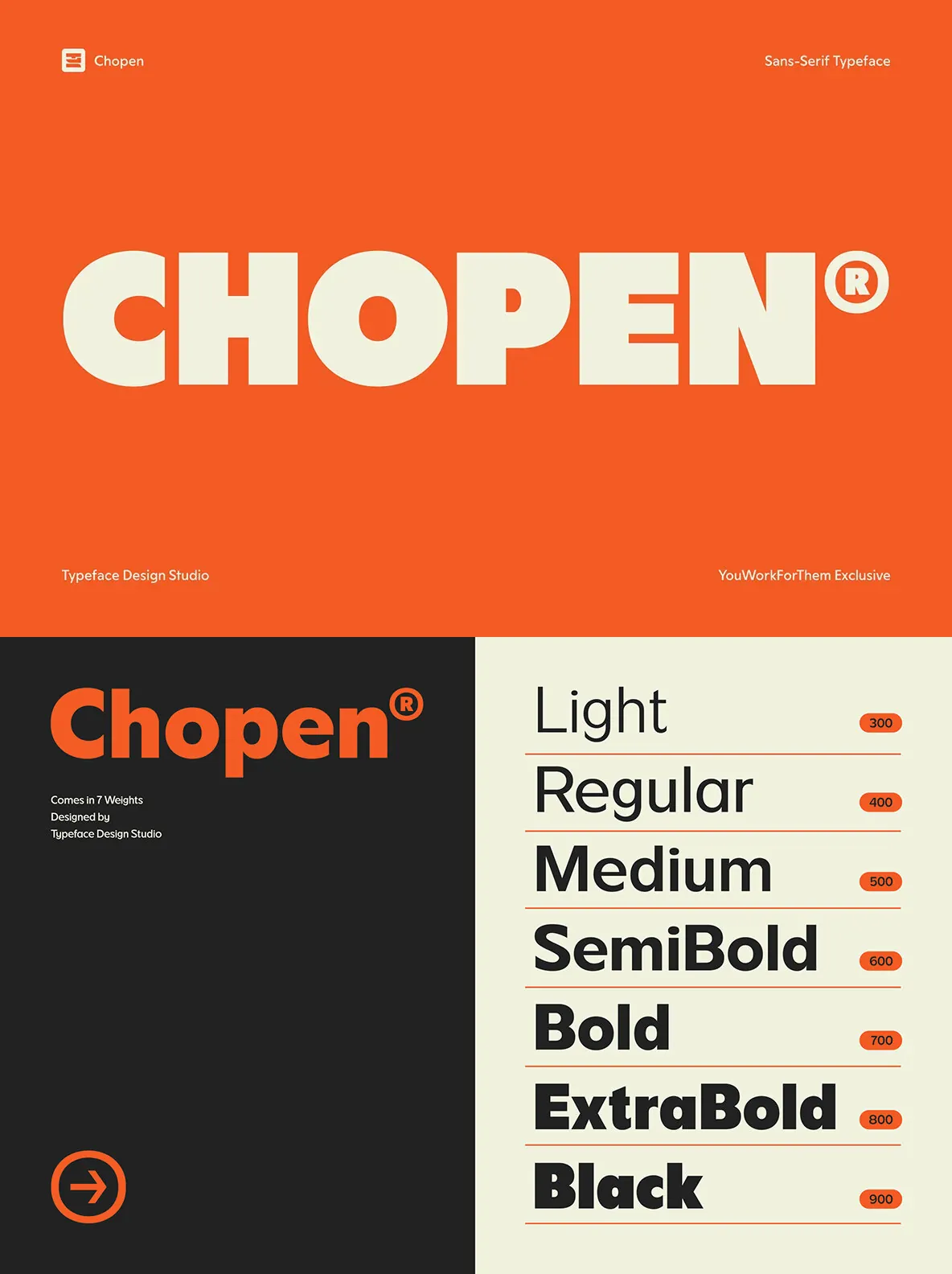 With seven weights extending from light through black, Chopen adapts to a broad range of typographic needs. Its versatility ensures consistent visual tone, whether deployed in nuanced editorial layouts or bold headline treatments.