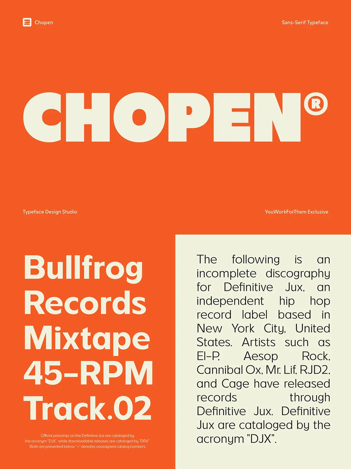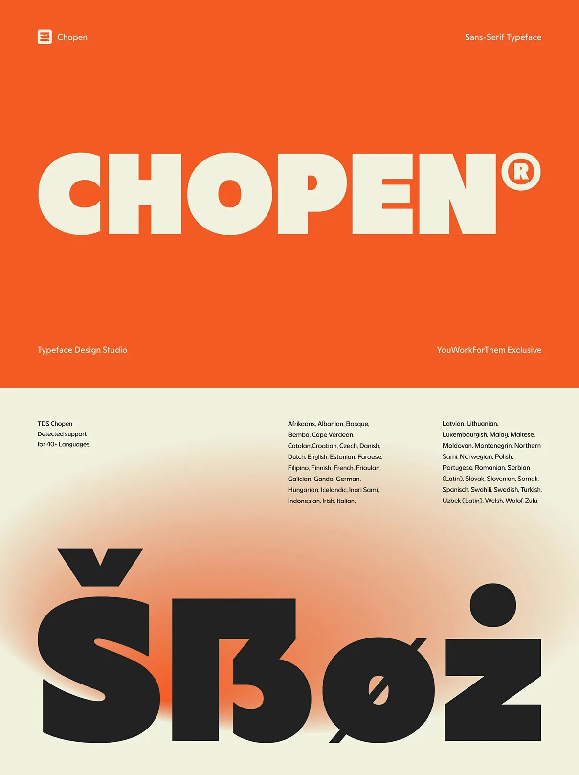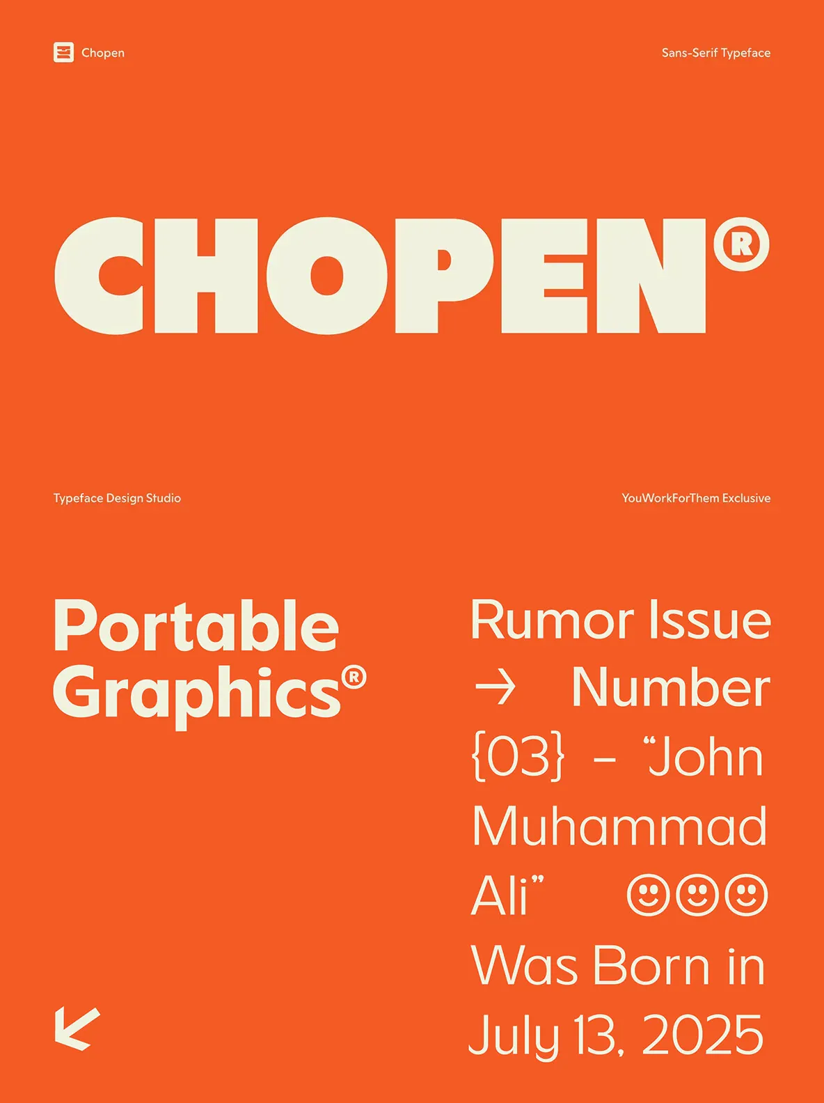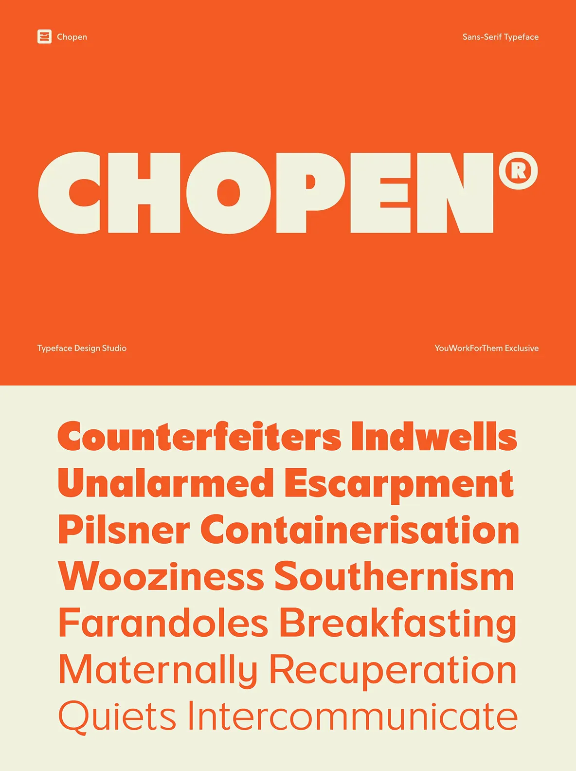 With seven weights extending from light through black, Chopen adapts to a broad range of typographic needs. Its versatility ensures consistent visual tone, whether deployed in nuanced editorial layouts or bold headline treatments.