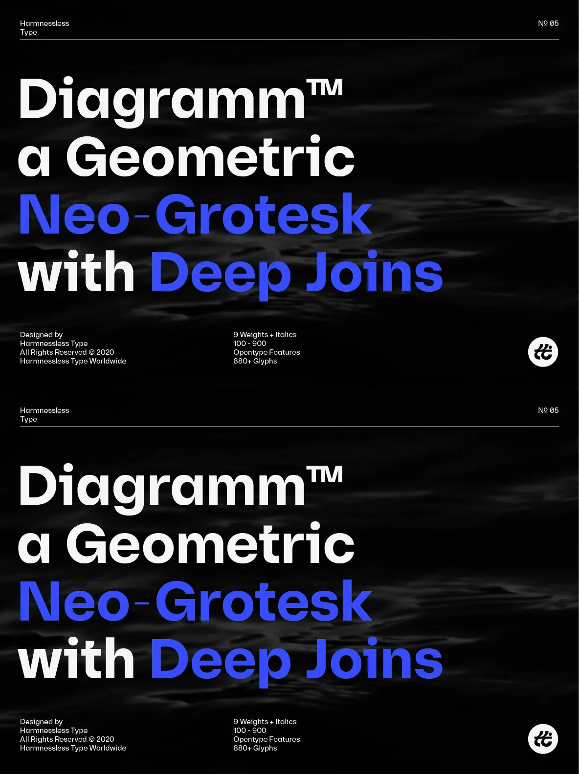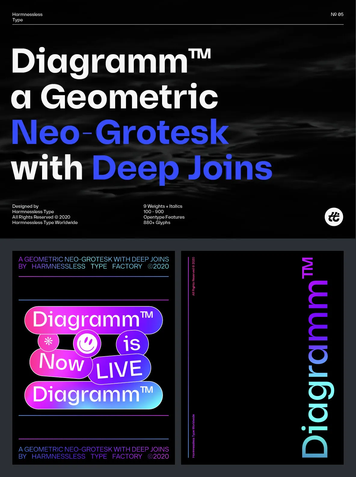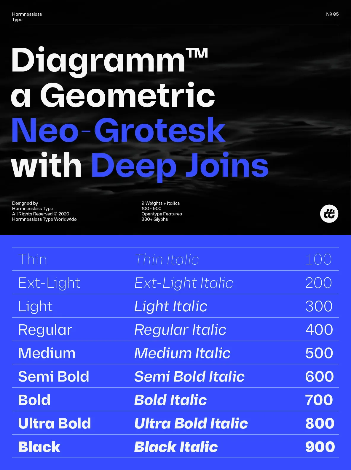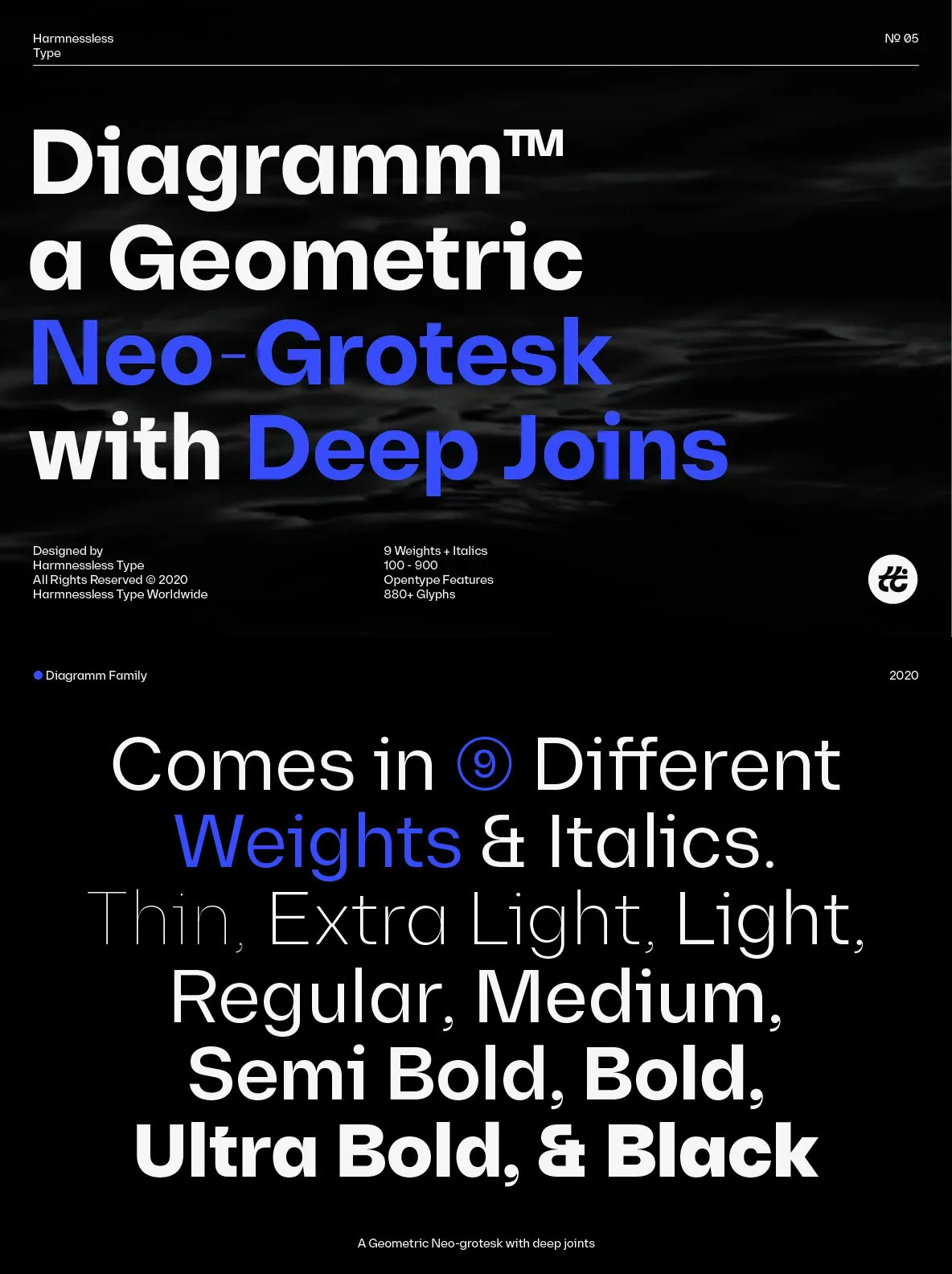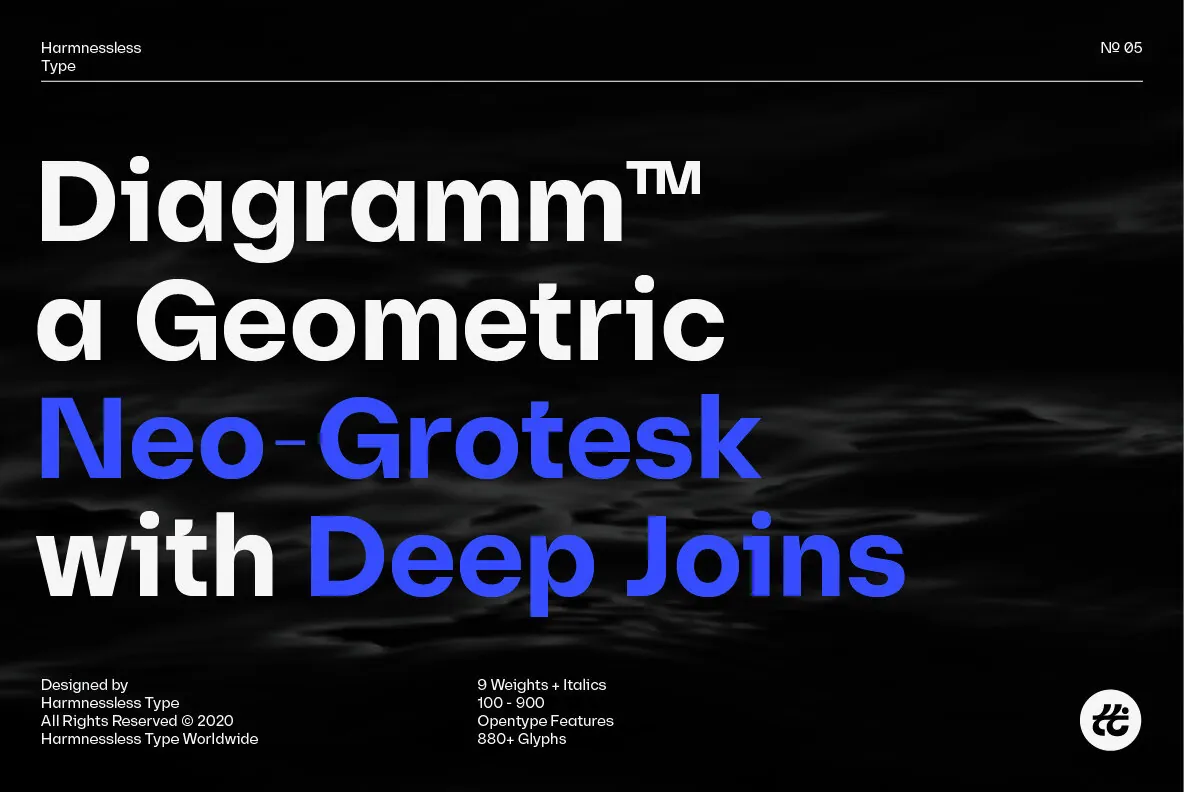 Diagramm designed by HarmnesslessType is a geometric Neo-Grotesk with deep and small joins. It comes in 18 weights, 9 uprights from Thin to Black, and its italics. Diagramm may look familiar but has a modern and contemporary feel at the same time.