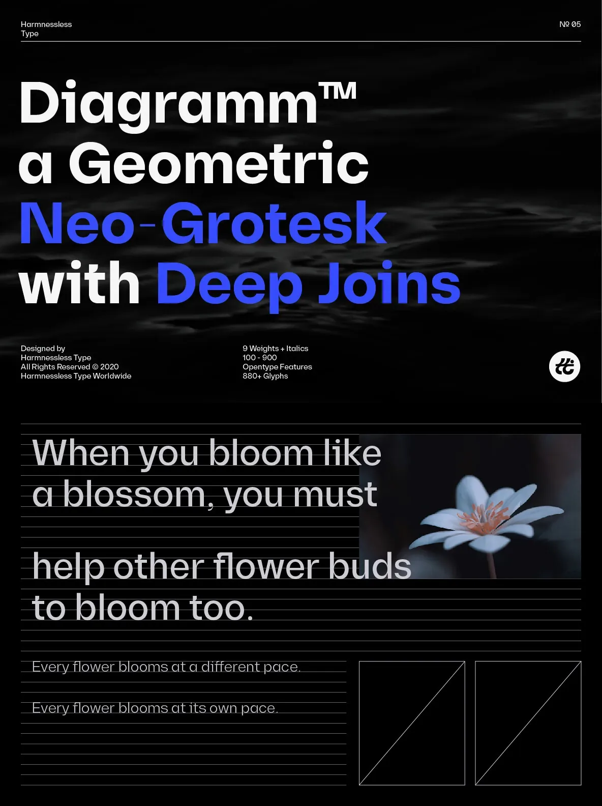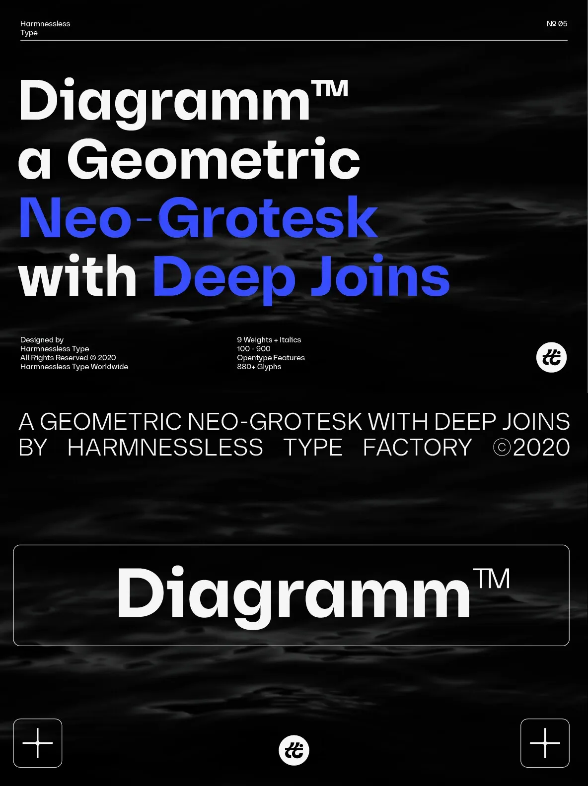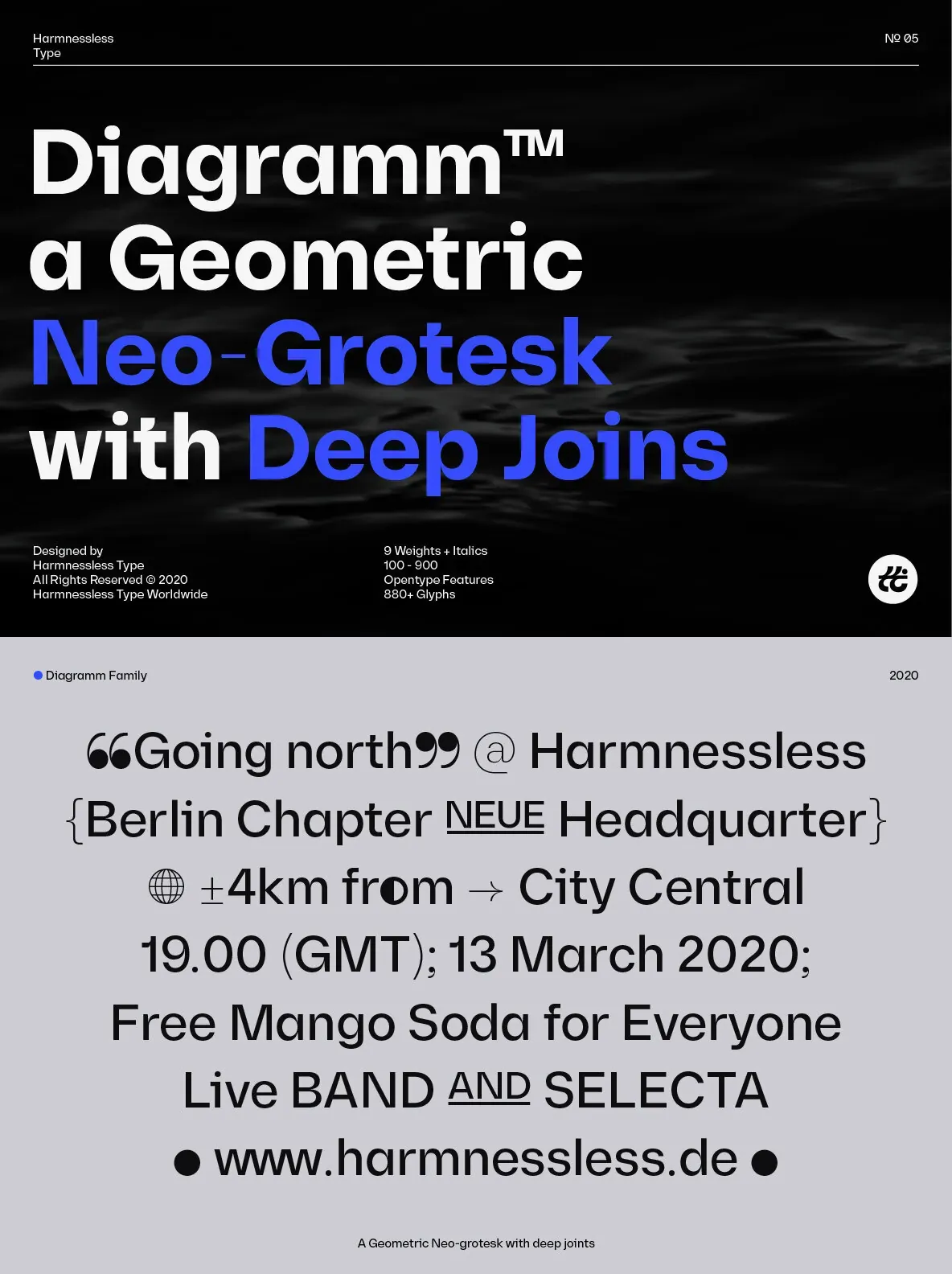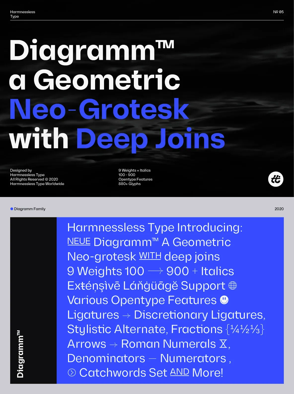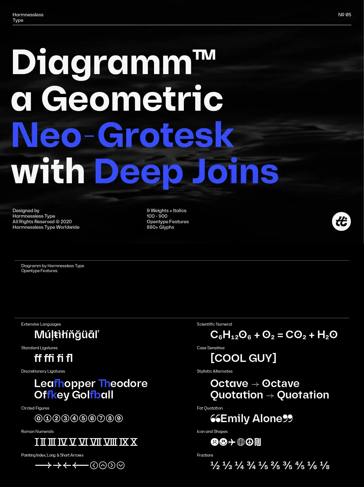 Diagramm designed by HarmnesslessType is a geometric Neo-Grotesk with deep and small joins. It comes in 18 weights, 9 uprights from Thin to Black, and its italics. Diagramm may look familiar but has a modern and contemporary feel at the same time.