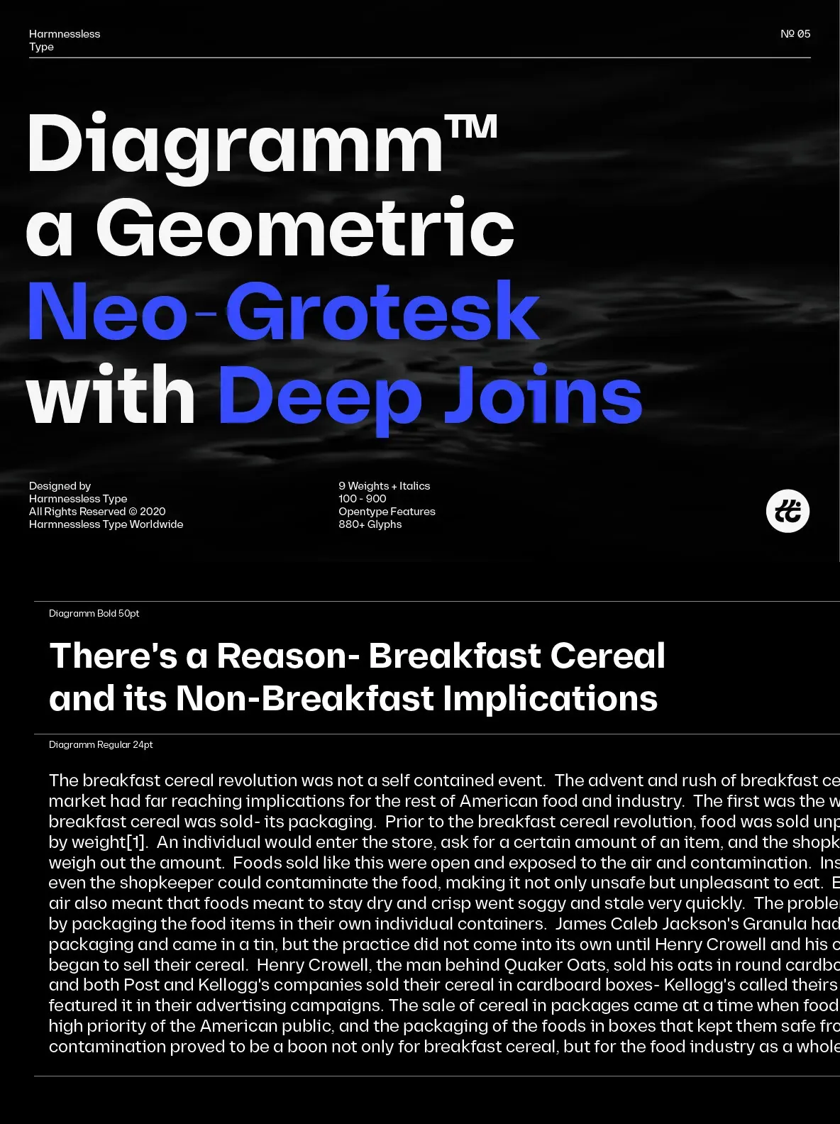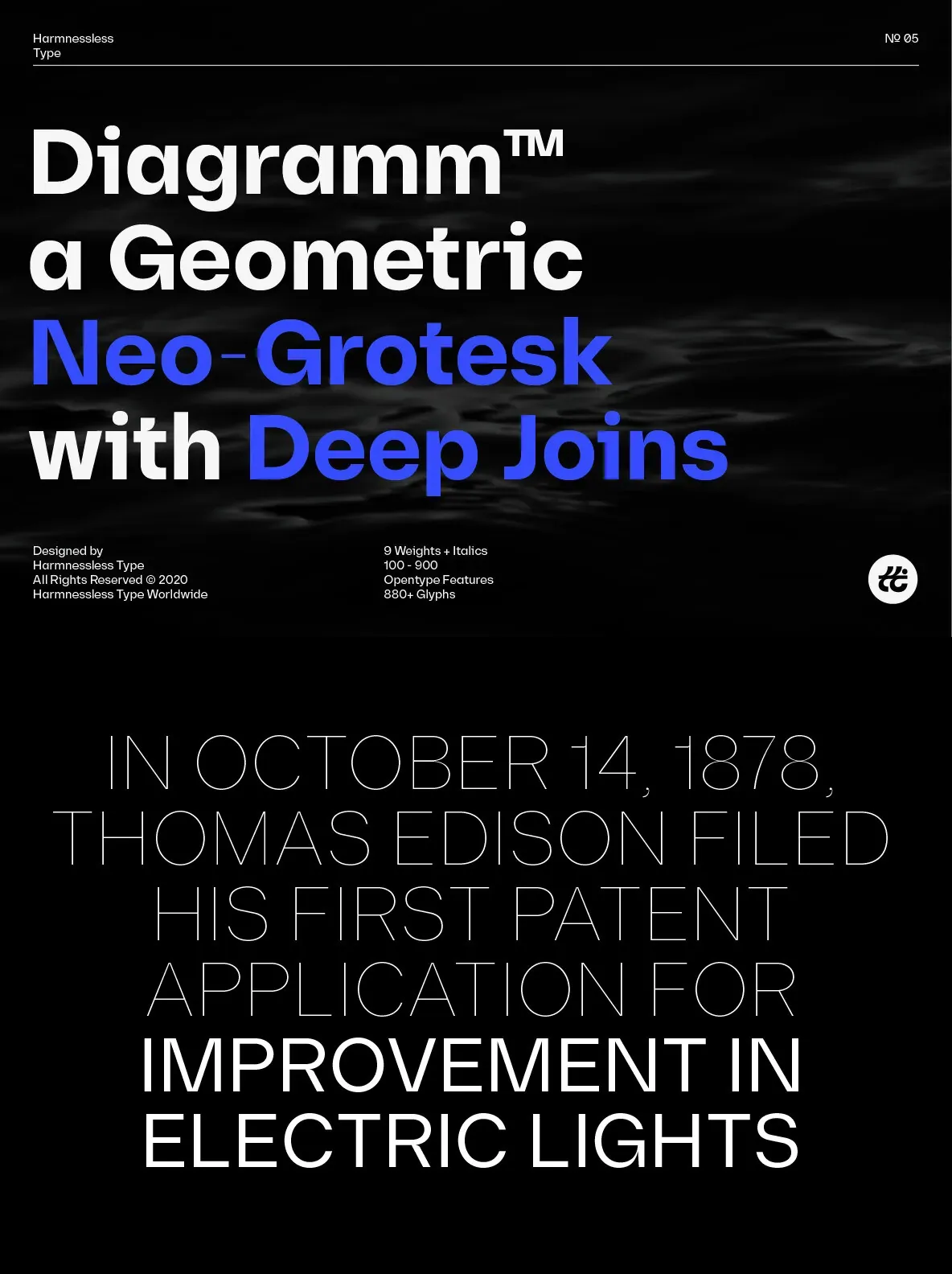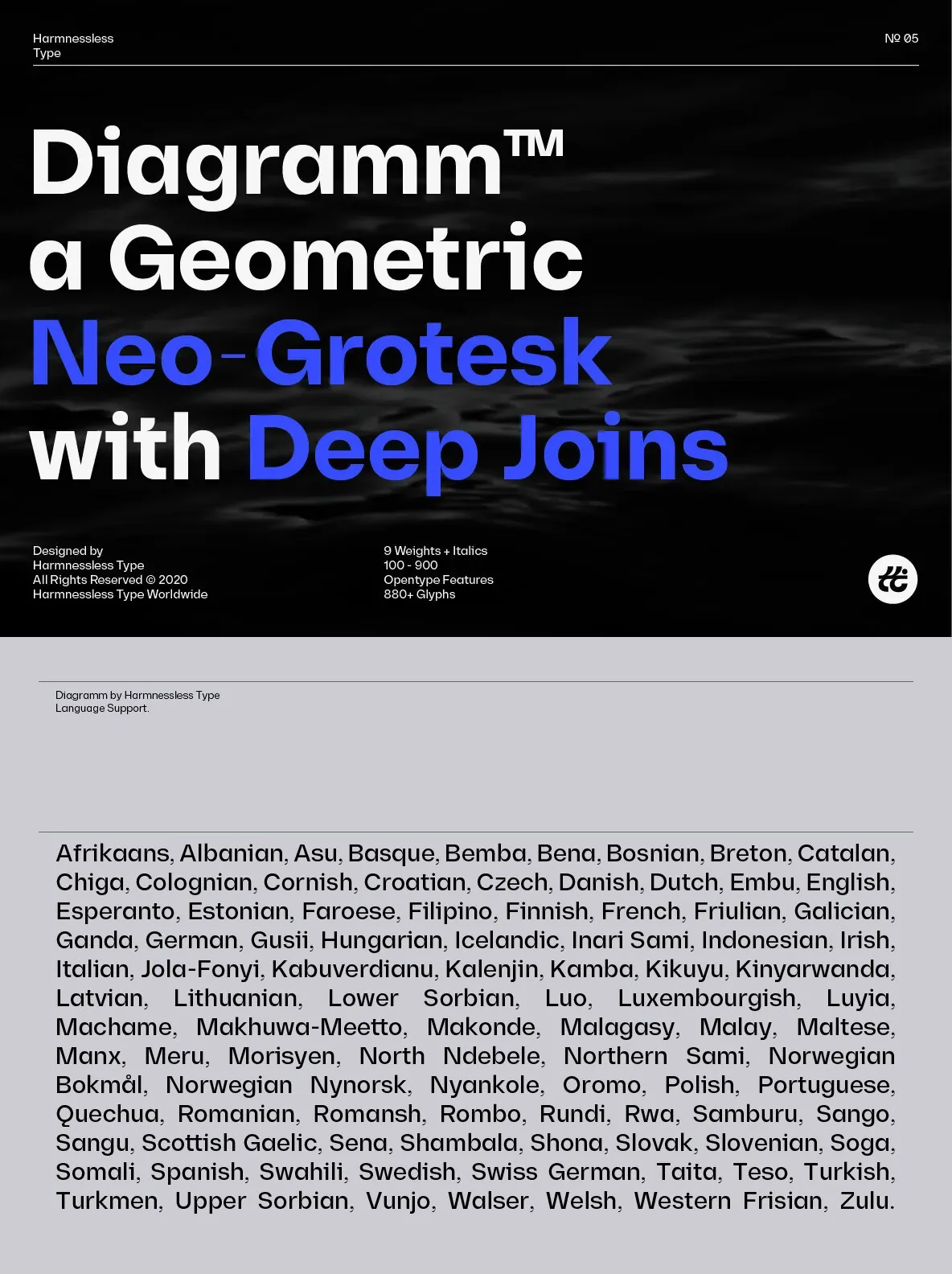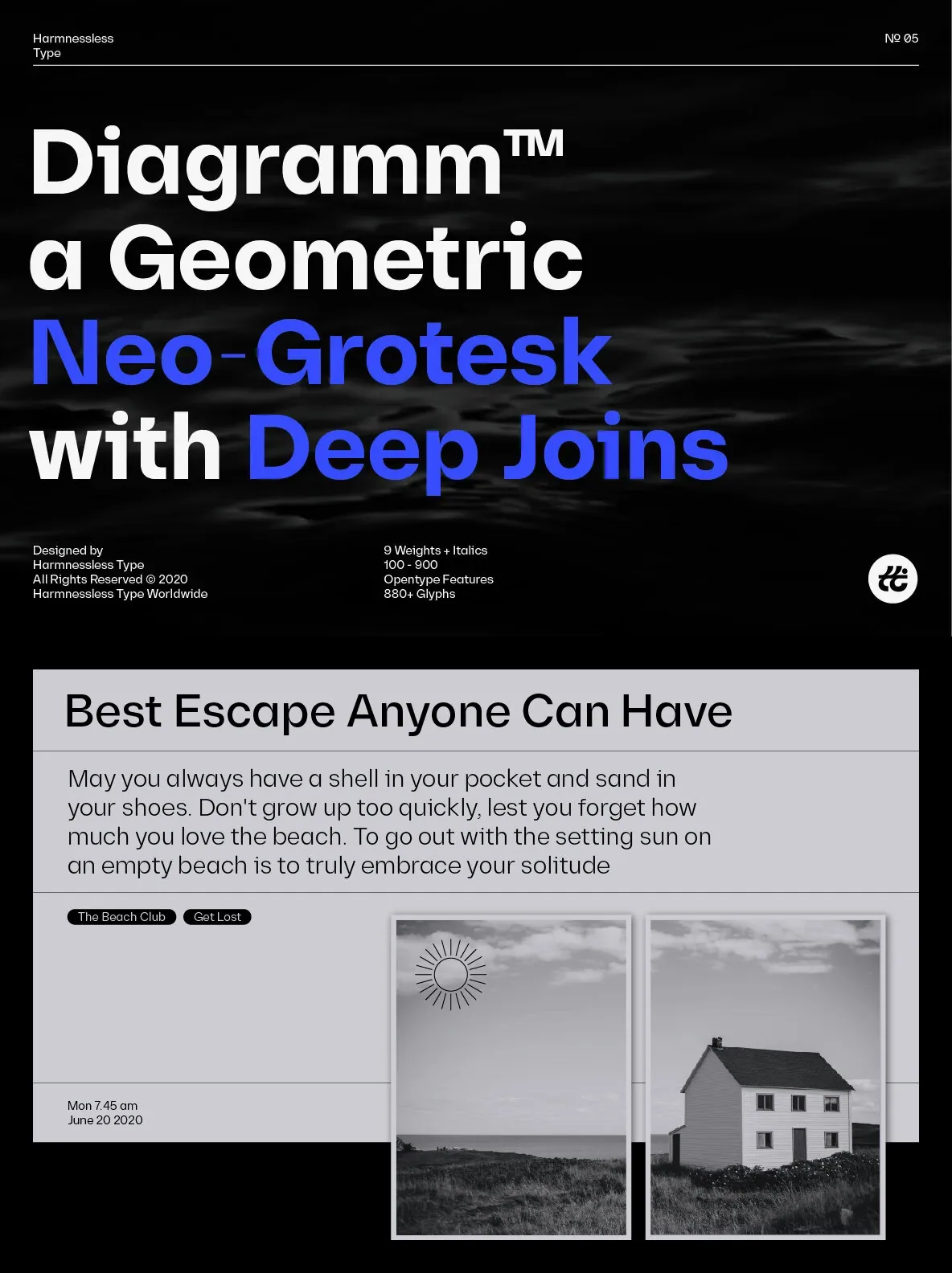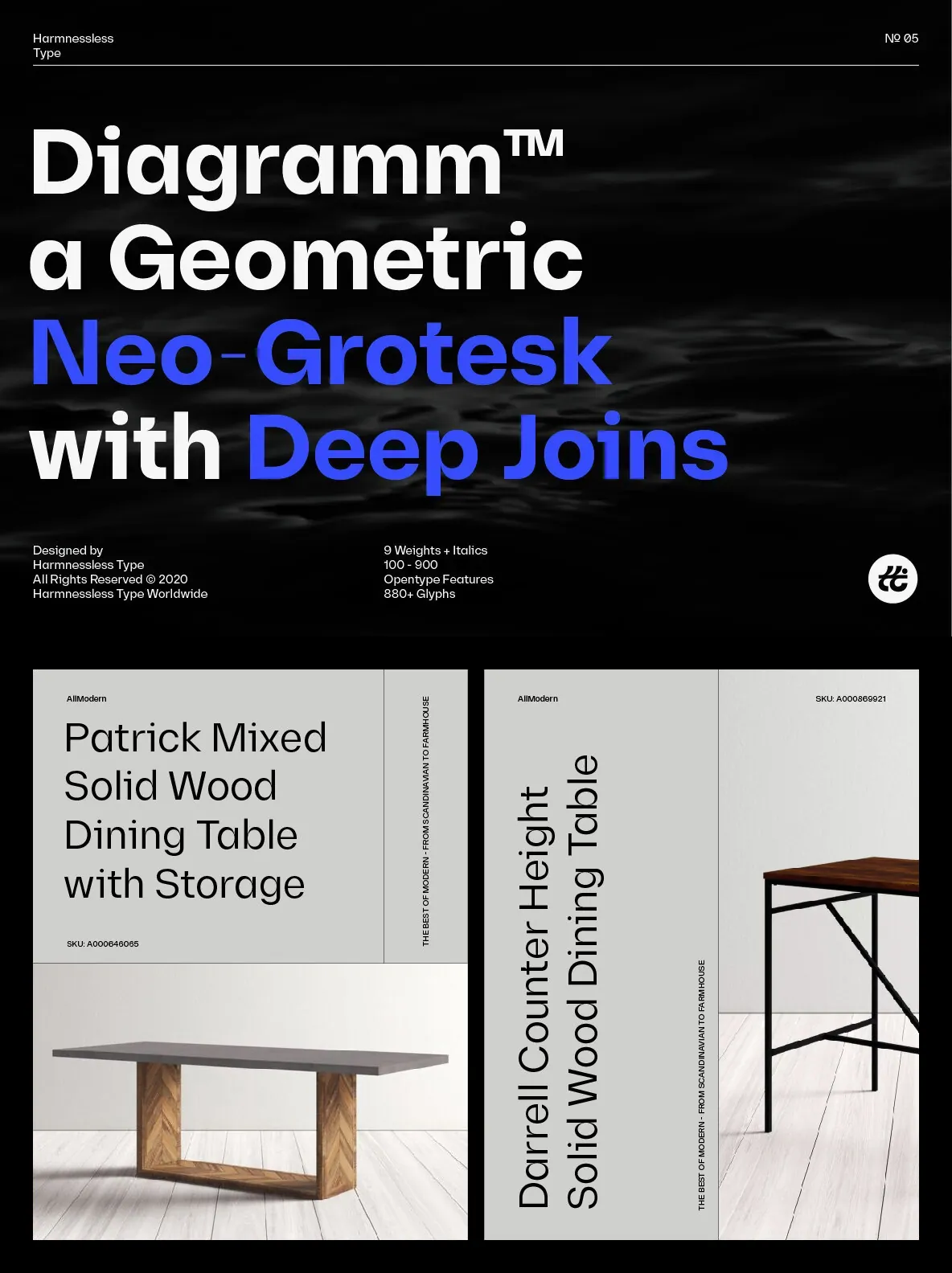 Diagramm designed by HarmnesslessType is a geometric Neo-Grotesk with deep and small joins. It comes in 18 weights, 9 uprights from Thin to Black, and its italics. Diagramm may look familiar but has a modern and contemporary feel at the same time.