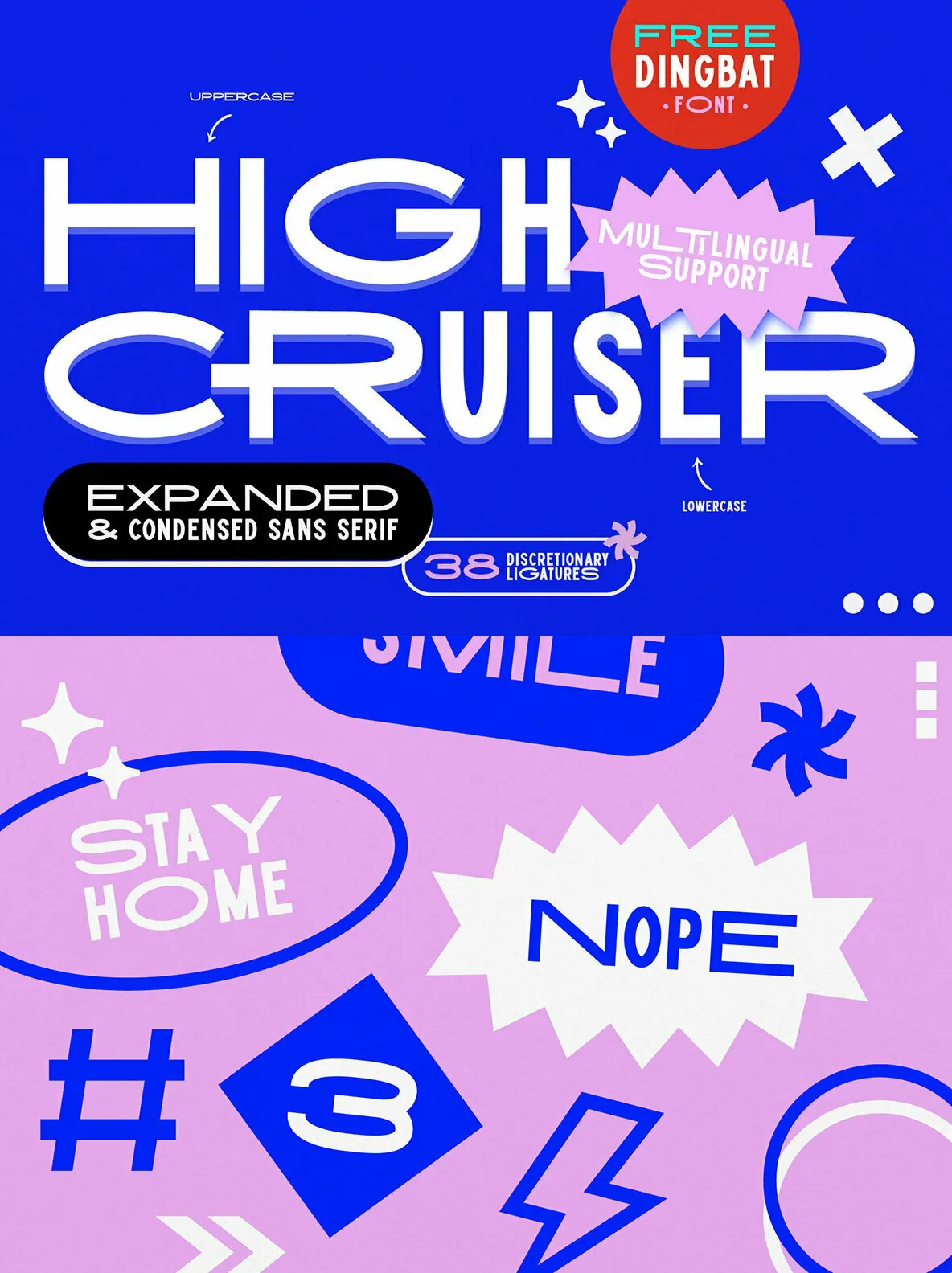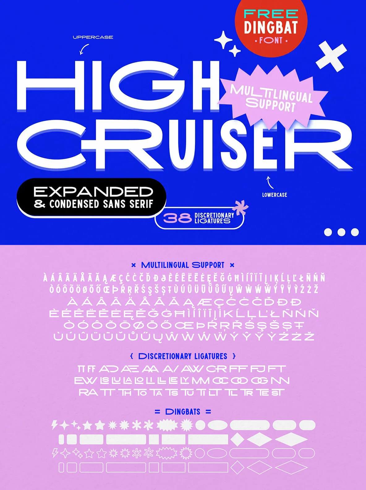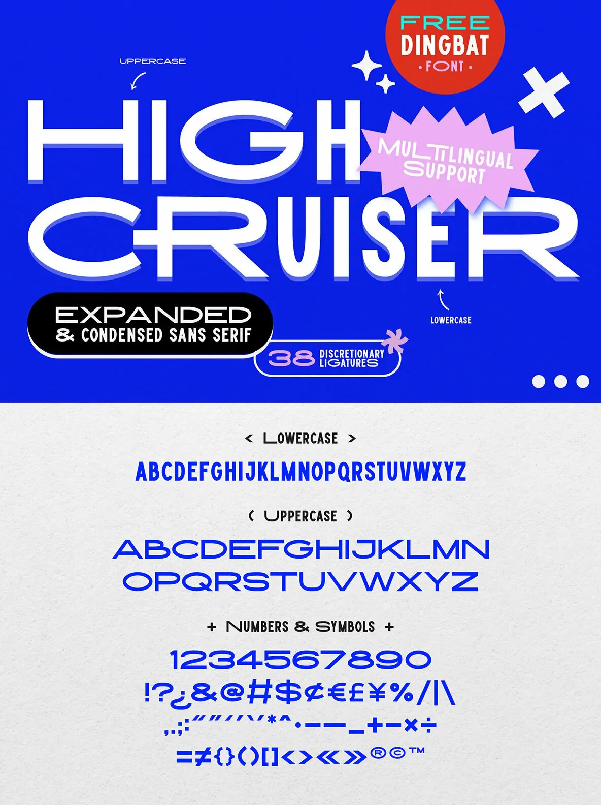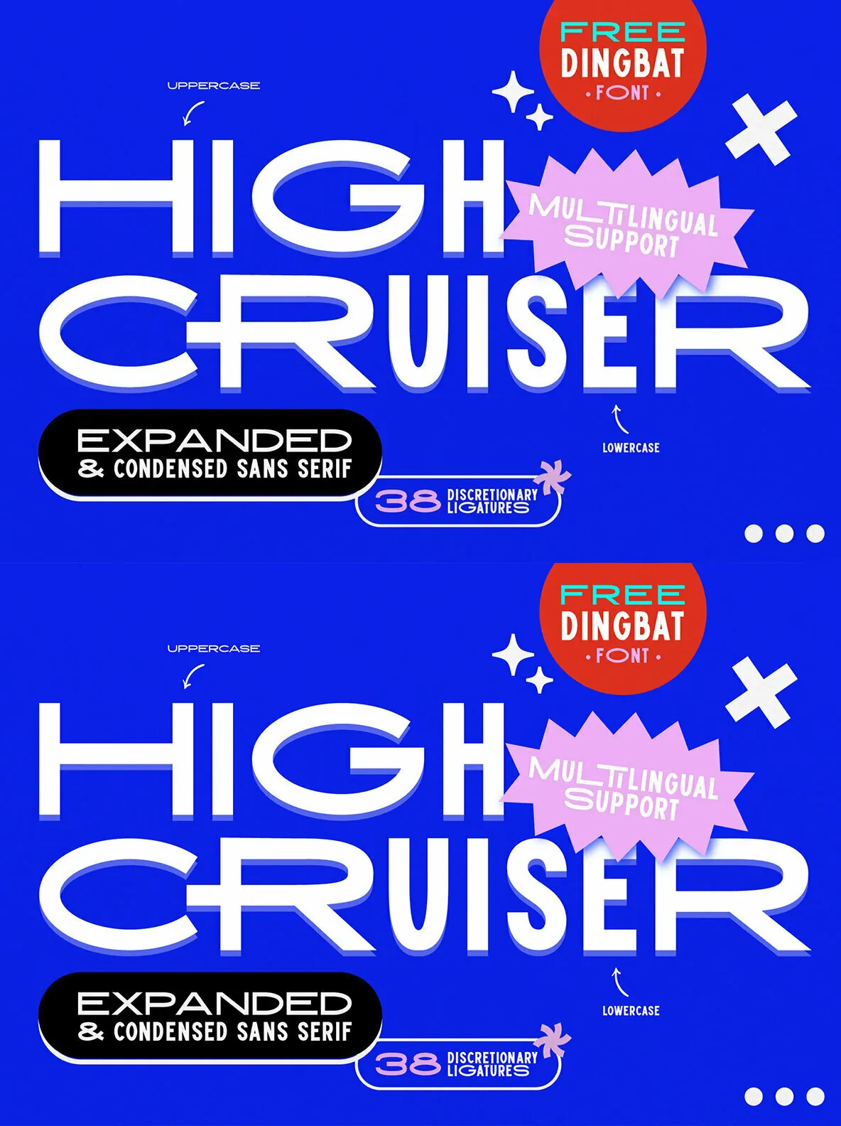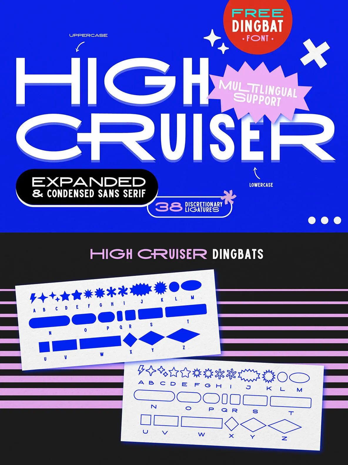 High Cruiser comes as a font duo – Regular & Dingbats. Switch between expanded and condensed version by using letter case, and design it further with the FREE dingbat font (a-z, A-Z) that was used in the visuals!