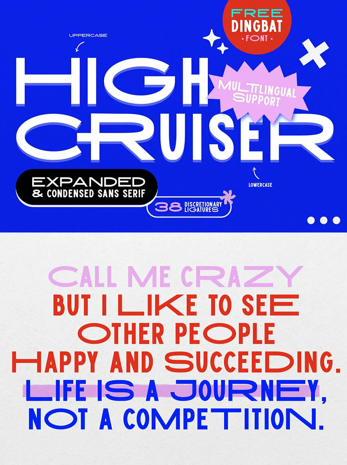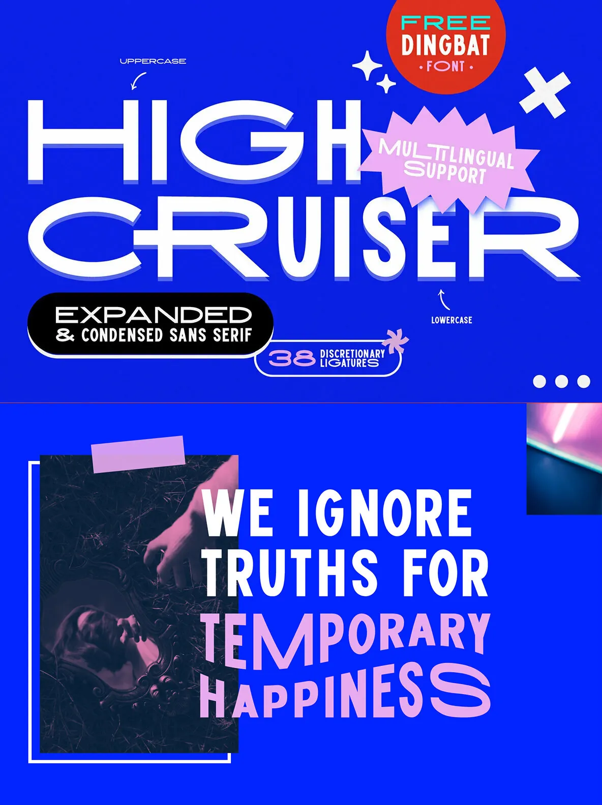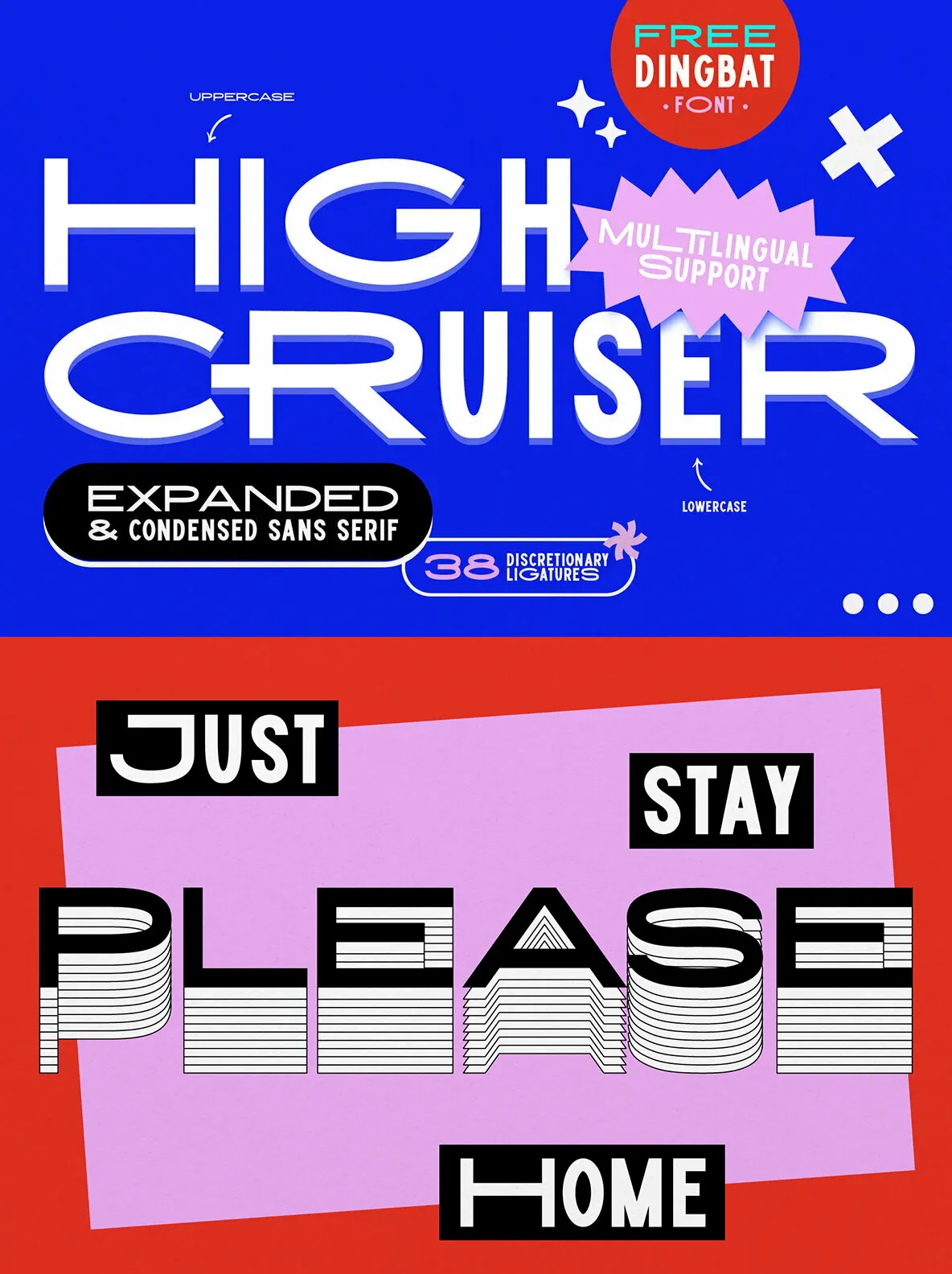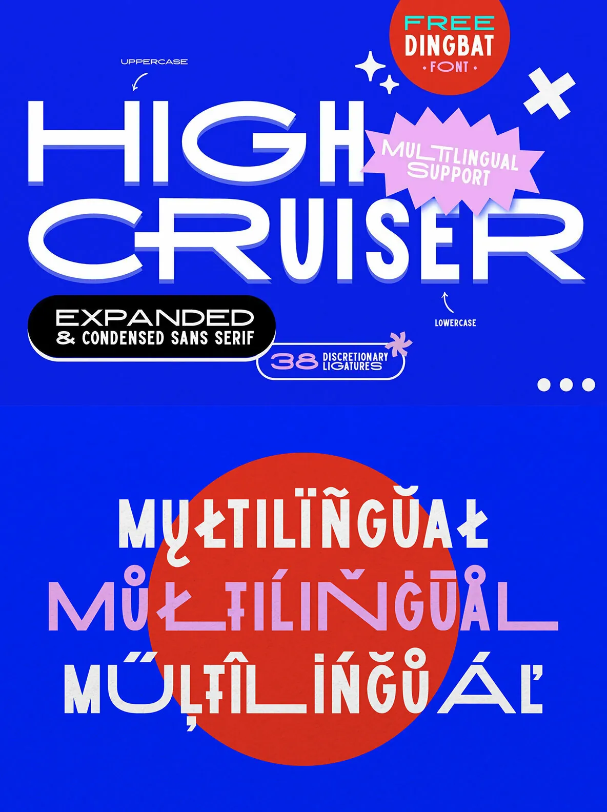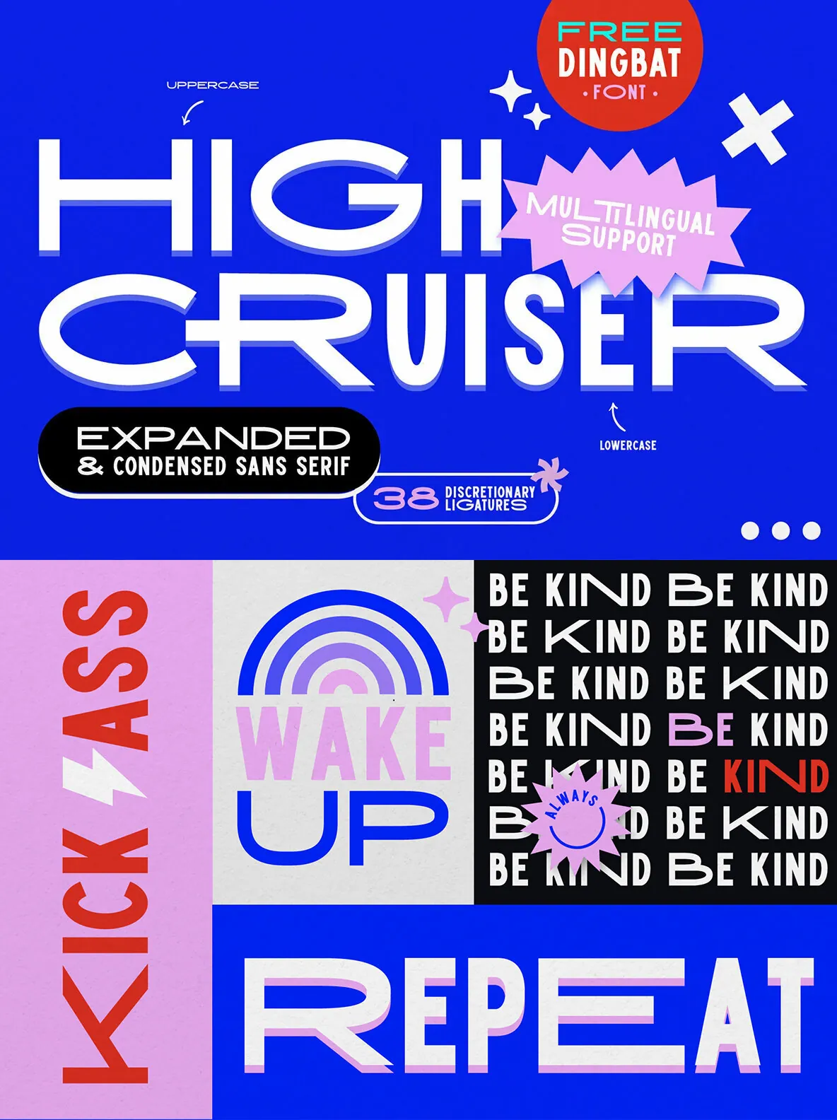 High Cruiser comes as a font duo – Regular & Dingbats. Switch between expanded and condensed version by using letter case, and design it further with the FREE dingbat font (a-z, A-Z) that was used in the visuals!