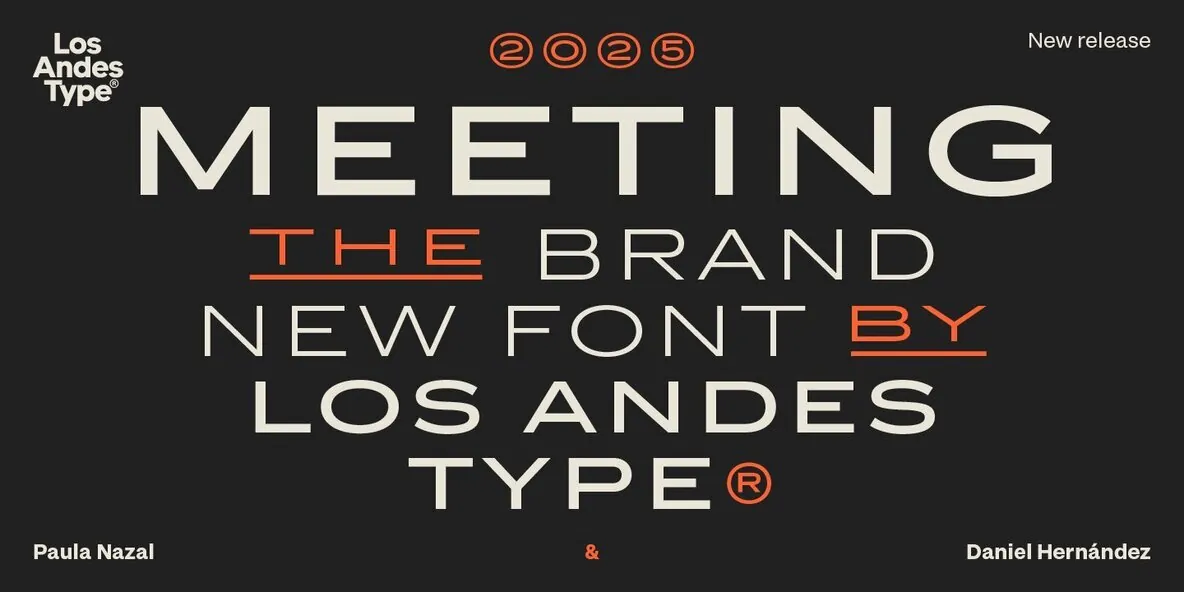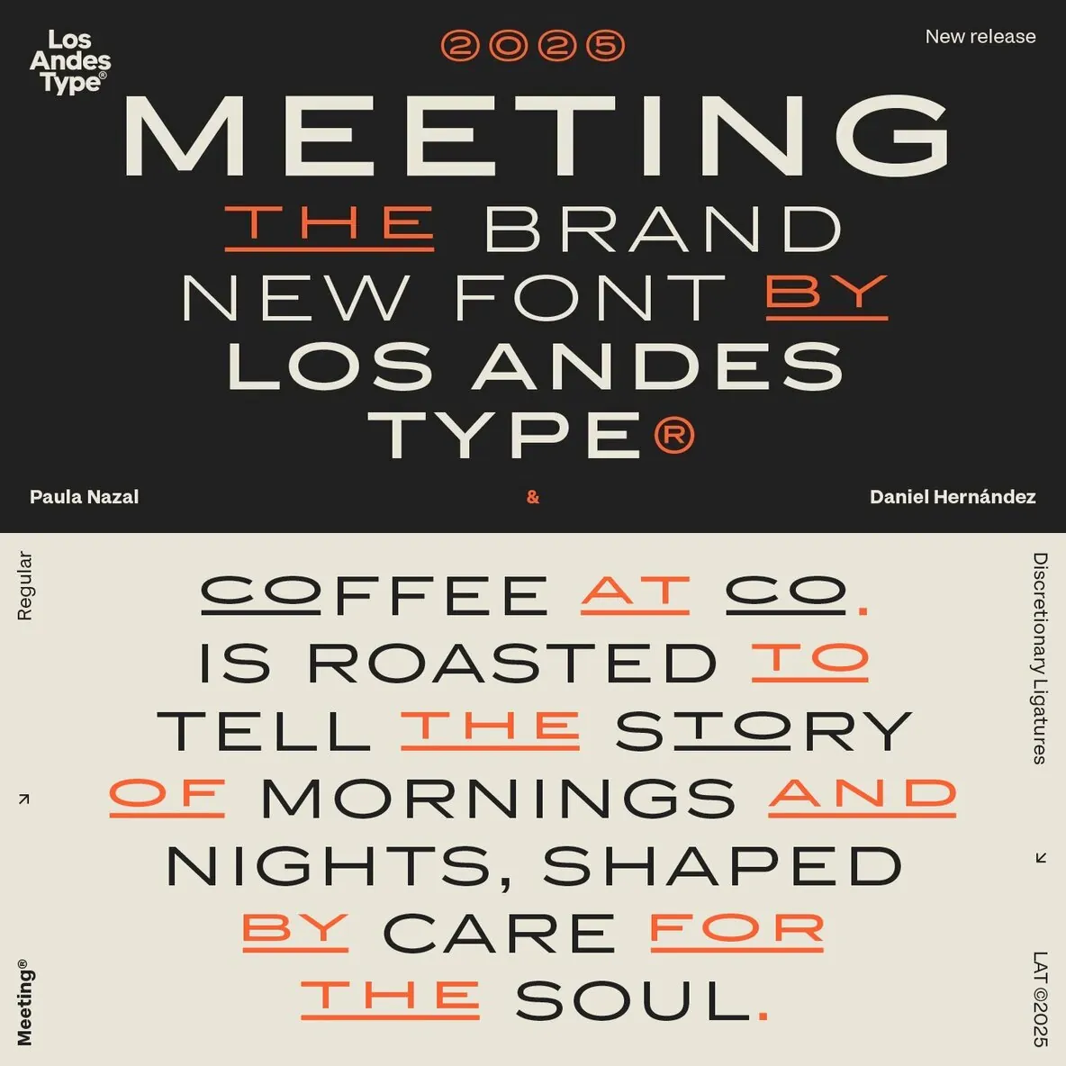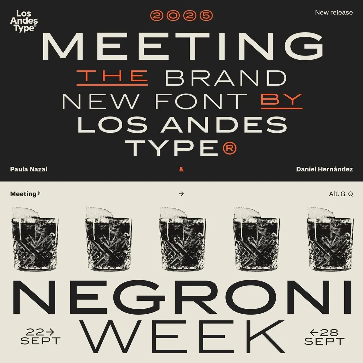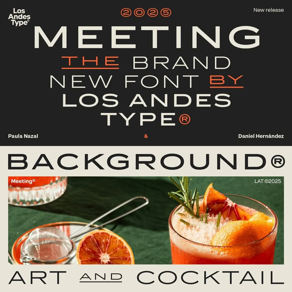 Designed by Los Andes Type, this family fits projects that demand character, from cocktail and coffee labels to festival posters. It also suits menus, music packaging, and handcrafted goods. Meeting balances the seriousness of a refined typeface with a subtle freshness, reminiscent of a well-balanced Negroni cocktail.
