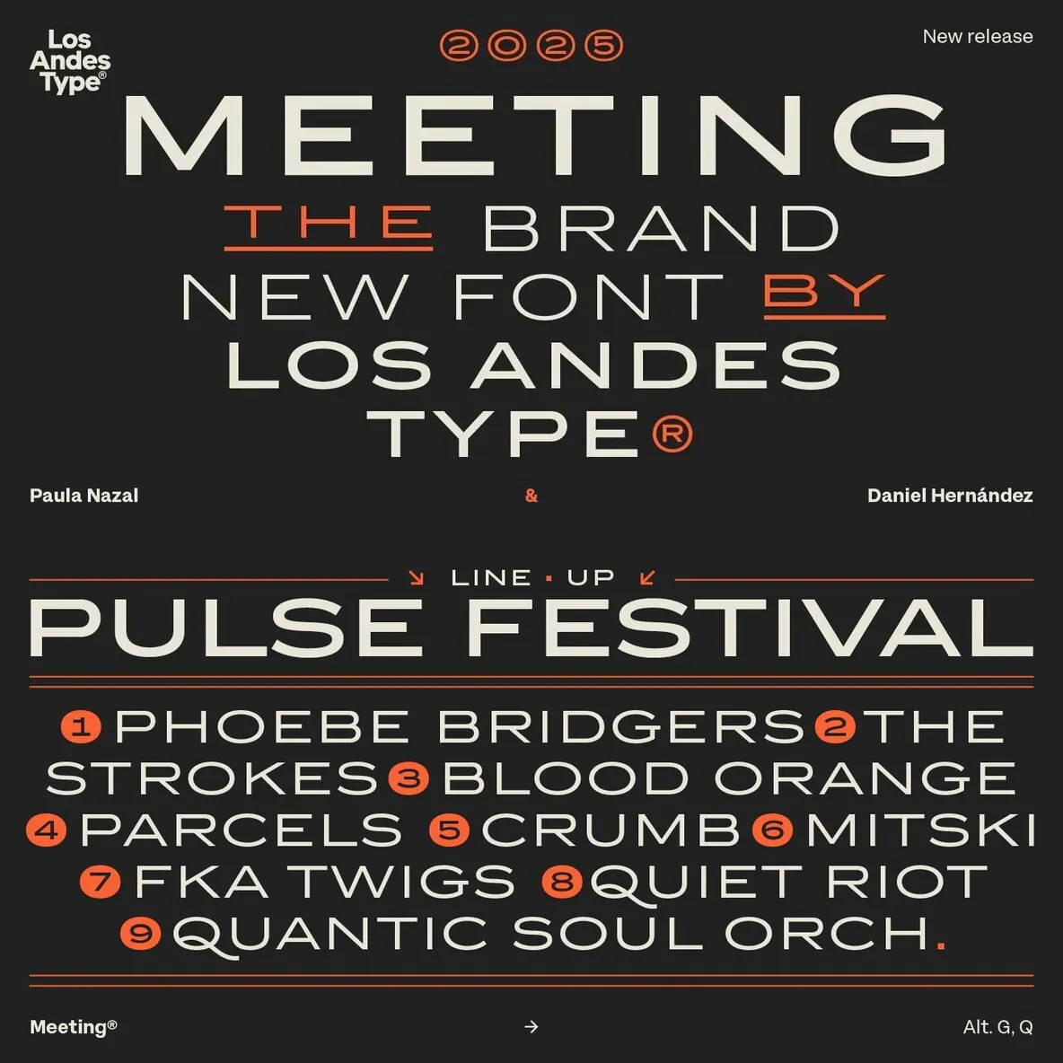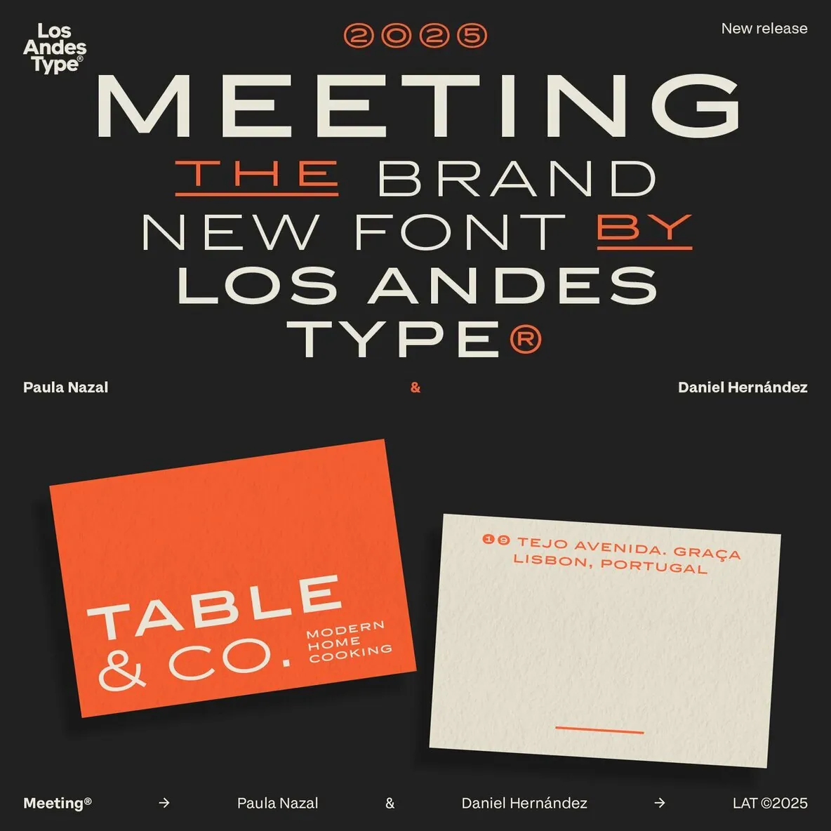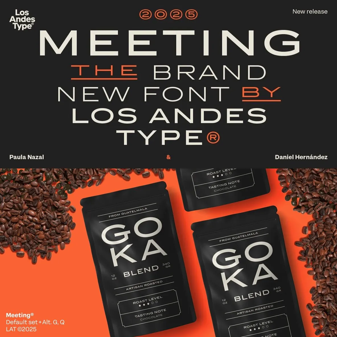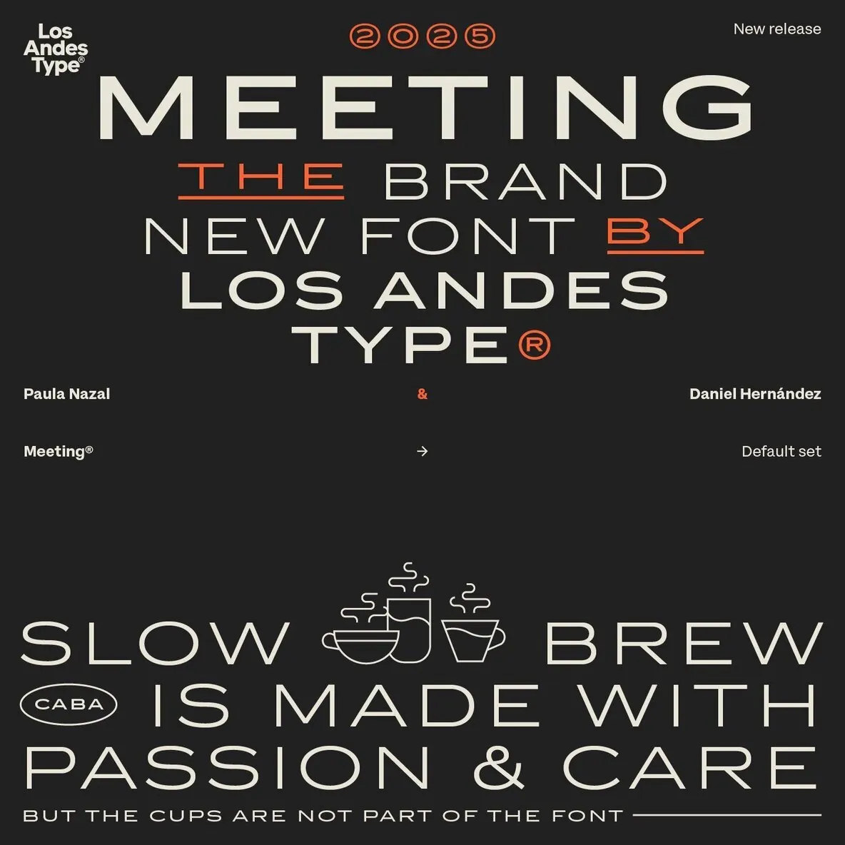 Designed by Los Andes Type, this family fits projects that demand character, from cocktail and coffee labels to festival posters. It also suits menus, music packaging, and handcrafted goods. Meeting balances the seriousness of a refined typeface with a subtle freshness, reminiscent of a well-balanced Negroni cocktail.