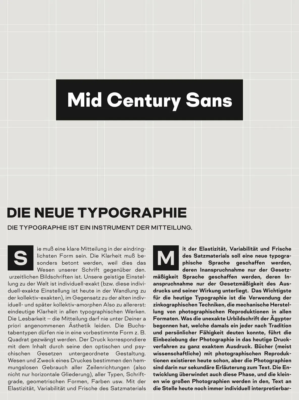 Mid Century Sans captures the essence of precise, geometric design inspired by the Bauhaus movement. This typeface uses high-geometric shapes to deliver clear, focused communication. Its structure echoes the principles set forth by László Moholy-Nagy, emphasizing the role of typography as an effective medium for visual clarity. The clean lines and balanced proportions create a typeface that stands out in editorial projects, branding, and digital interfaces.