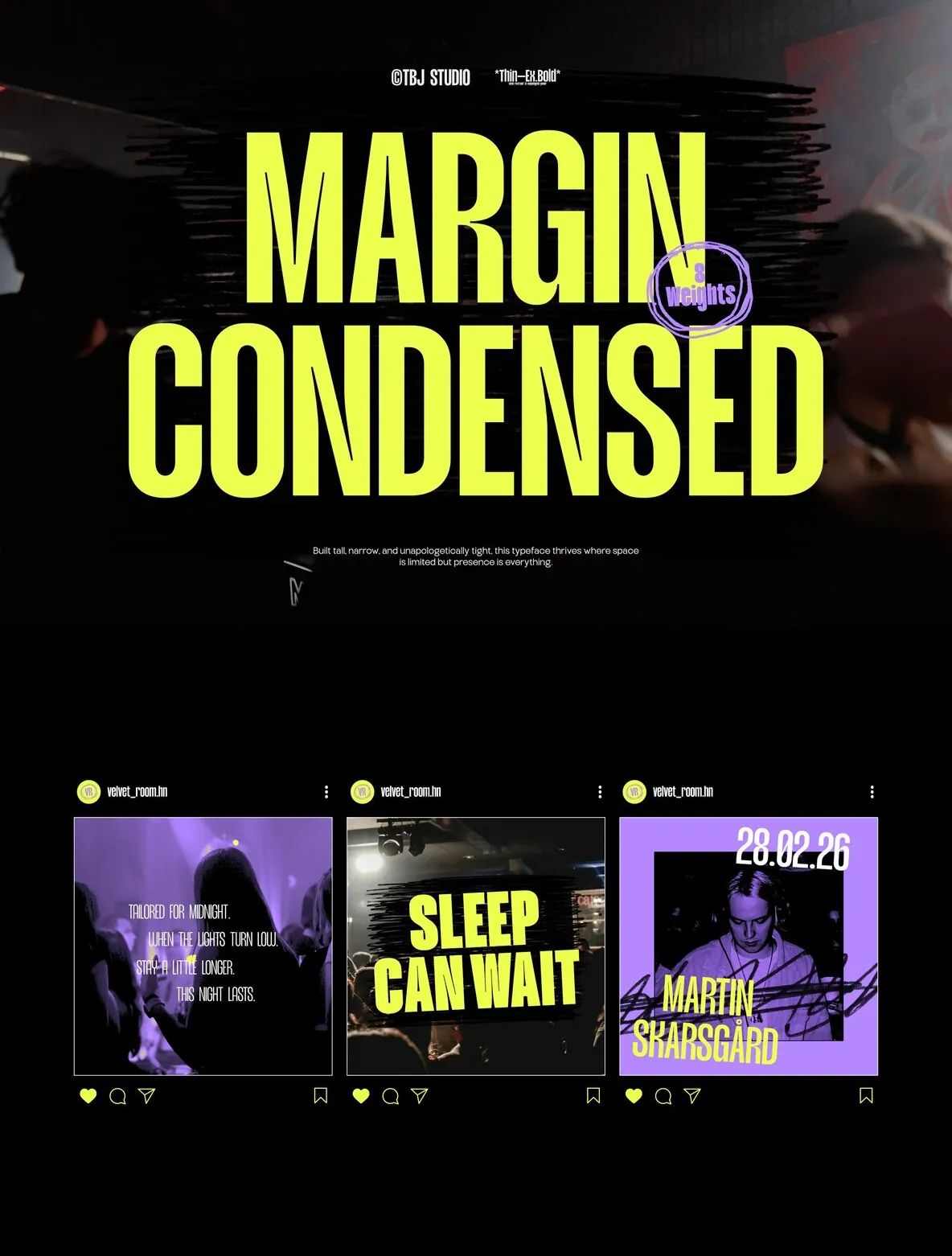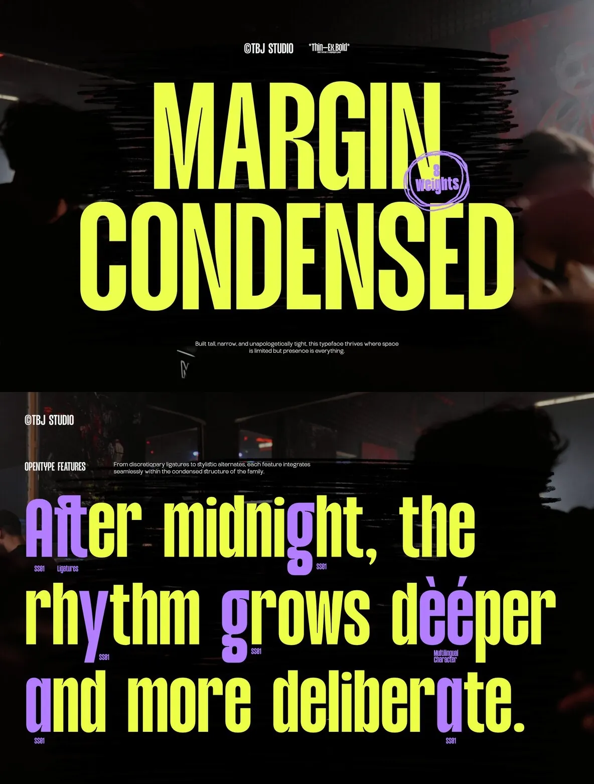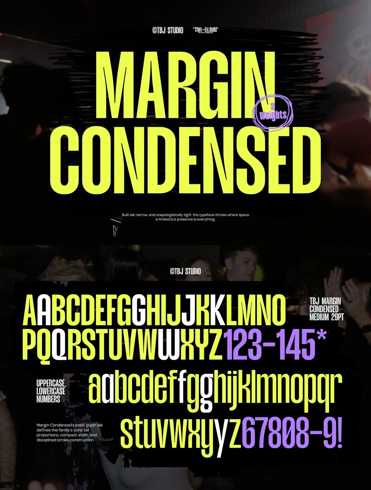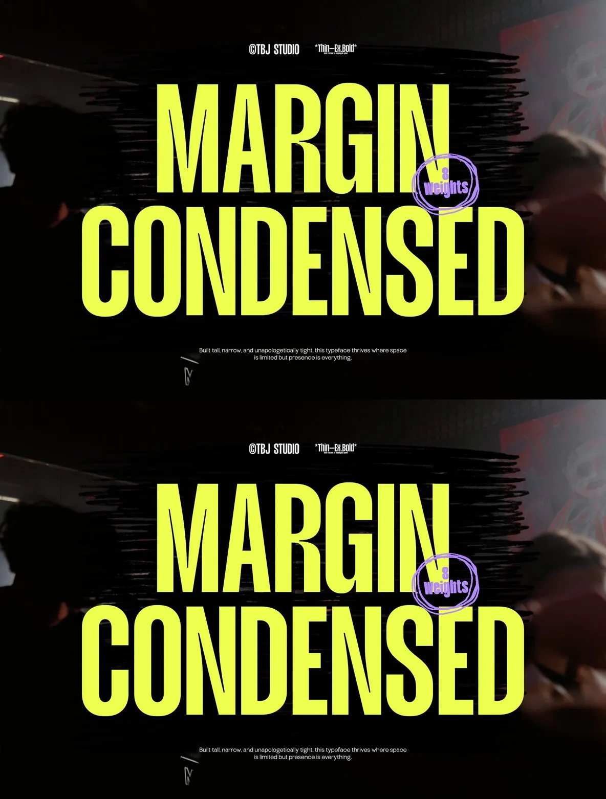 Designed for designers who need strength, precision, and vertical power in one cohesive family, TBJ Margin Condensed delivers confident typography that performs across modern visual communication.