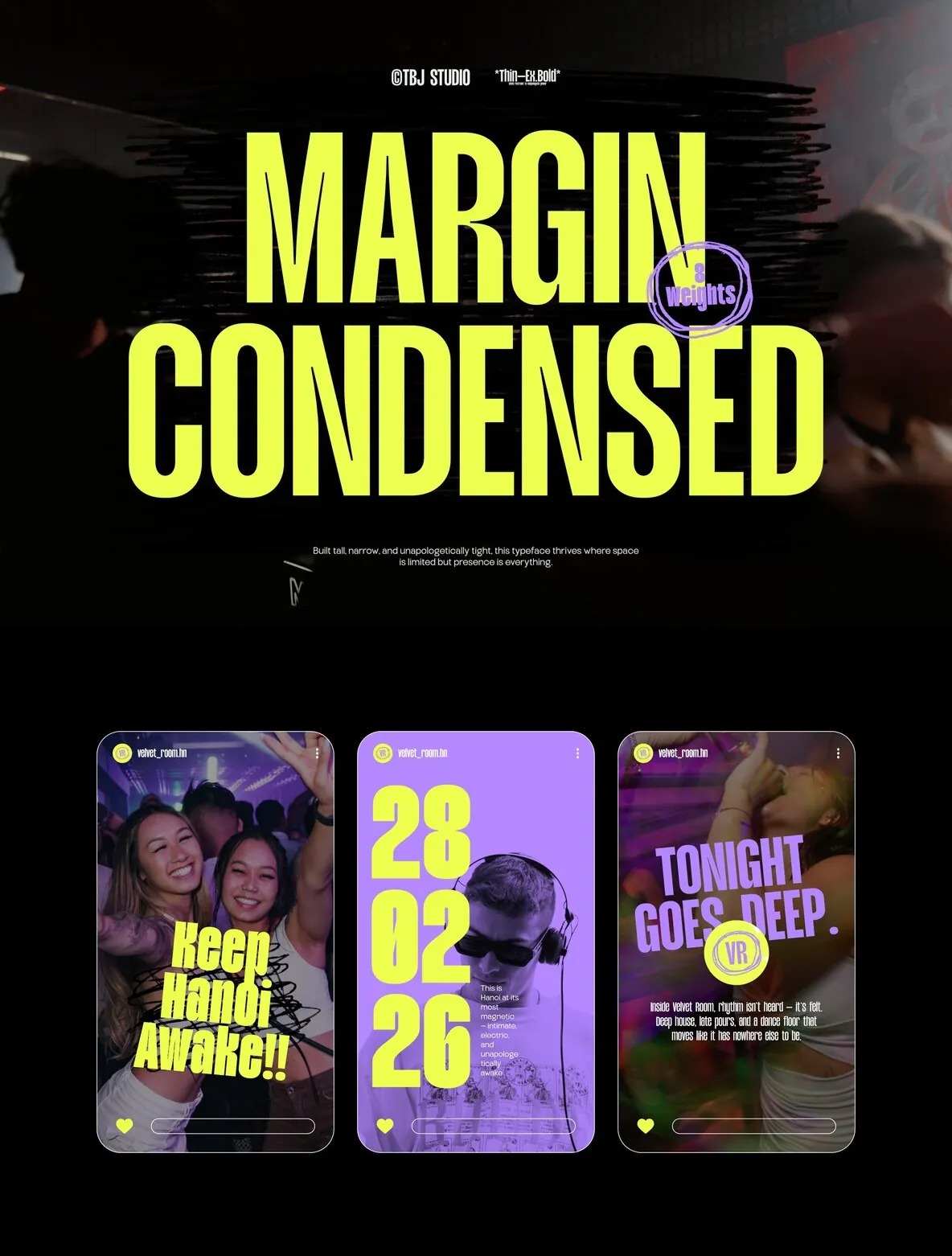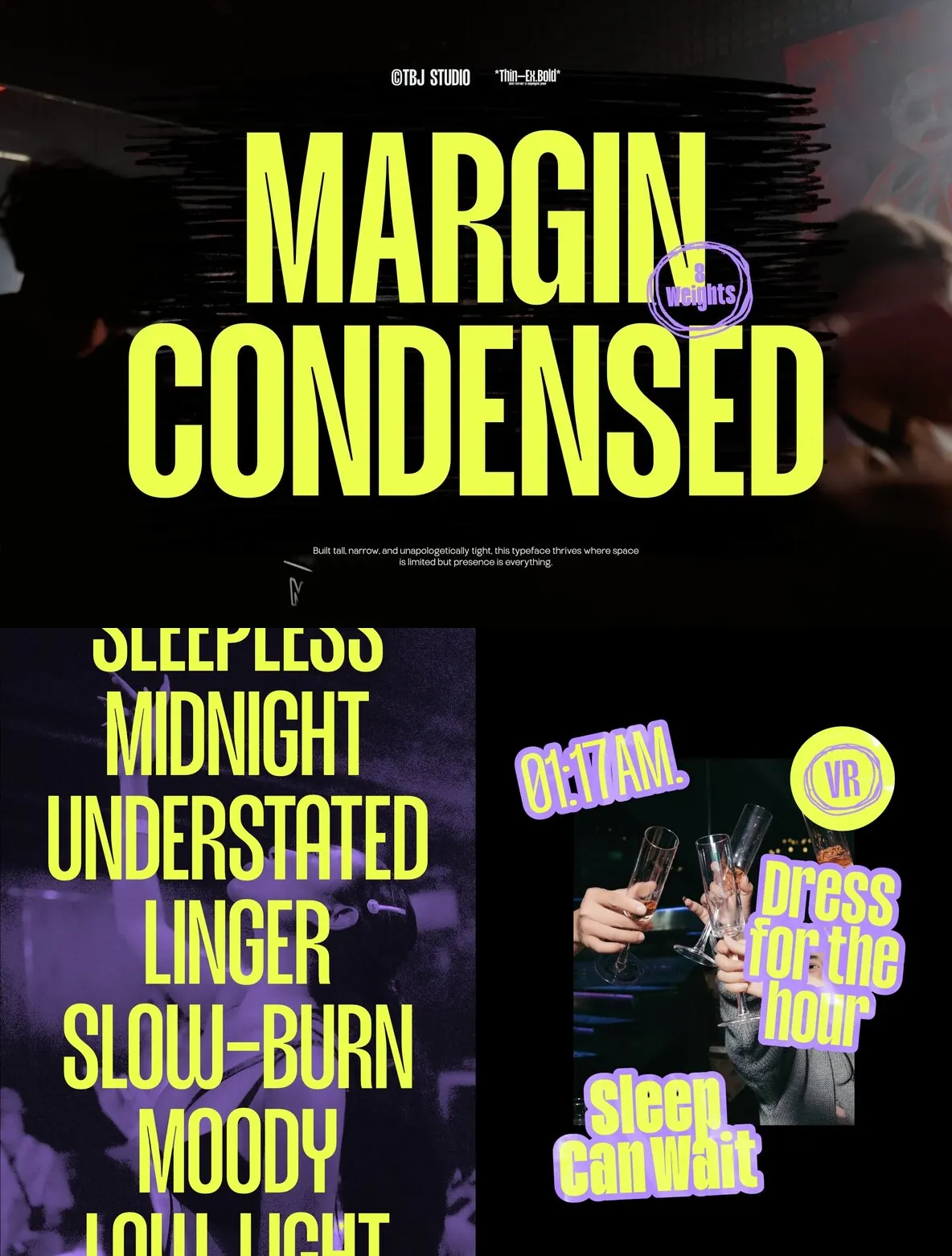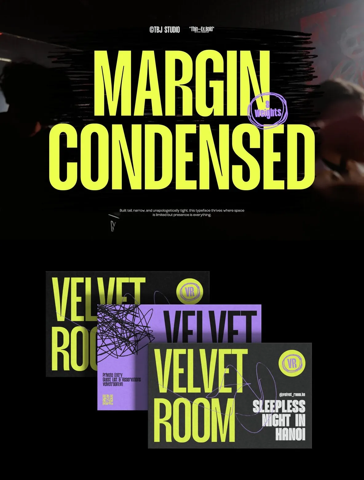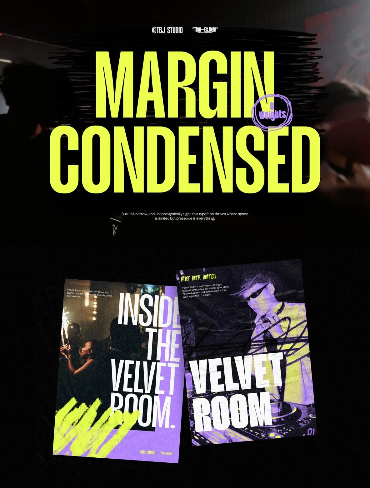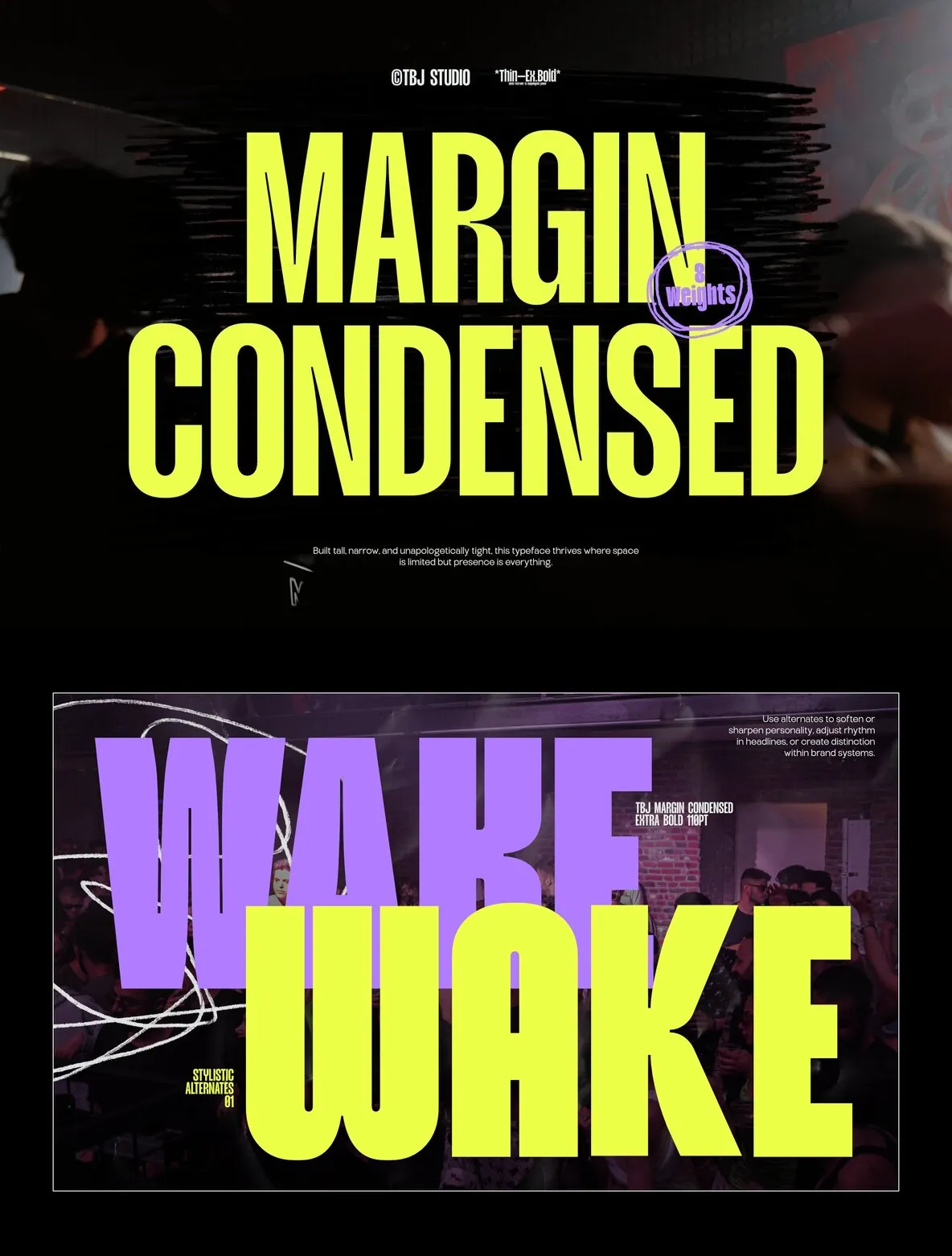 Designed for designers who need strength, precision, and vertical power in one cohesive family, TBJ Margin Condensed delivers confident typography that performs across modern visual communication.