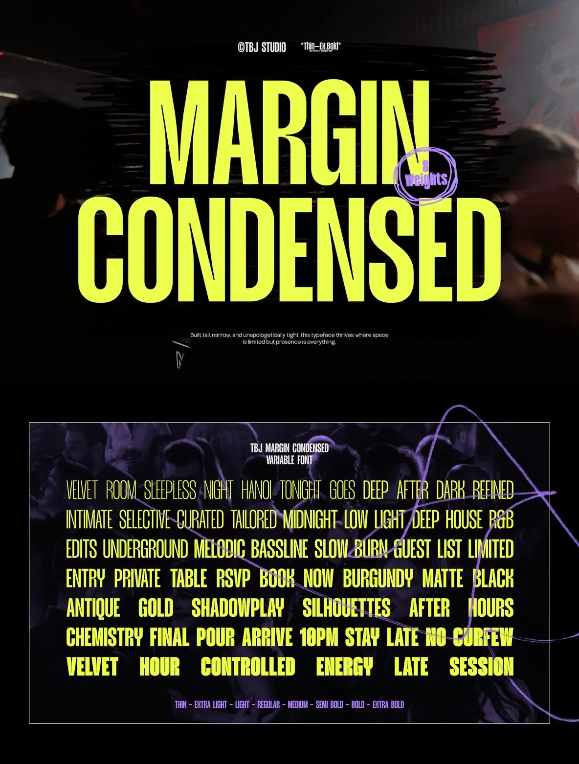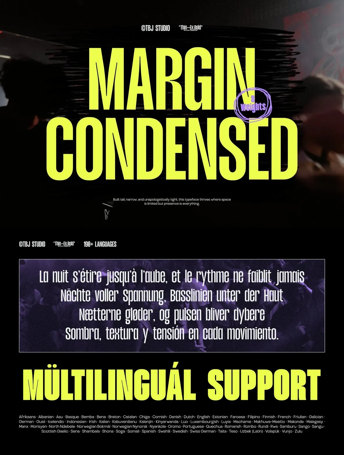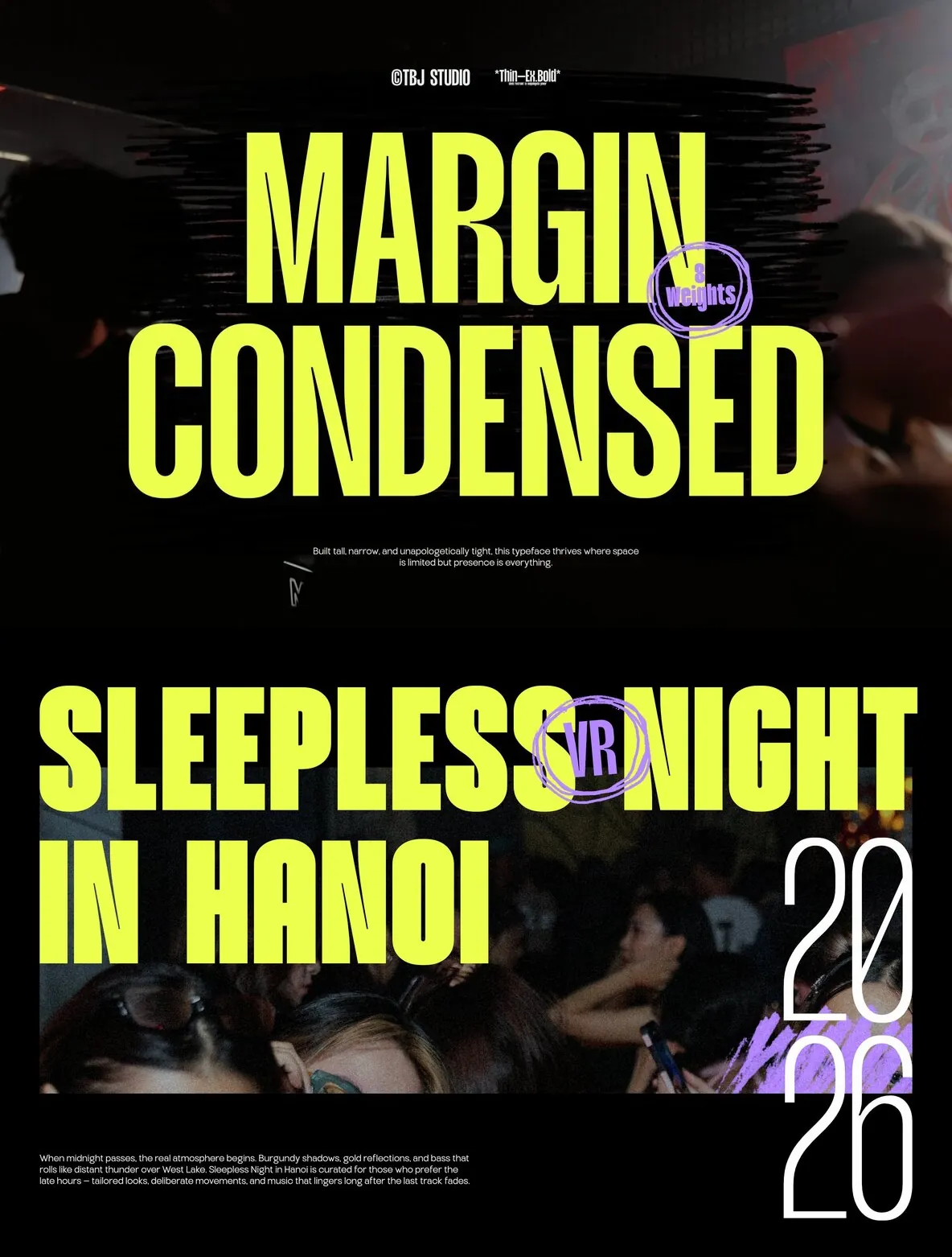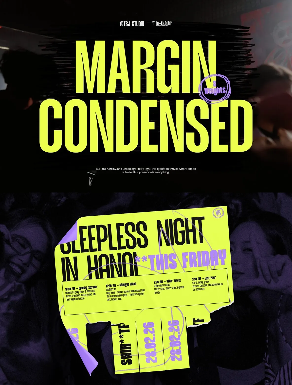 Designed for designers who need strength, precision, and vertical power in one cohesive family, TBJ Margin Condensed delivers confident typography that performs across modern visual communication.