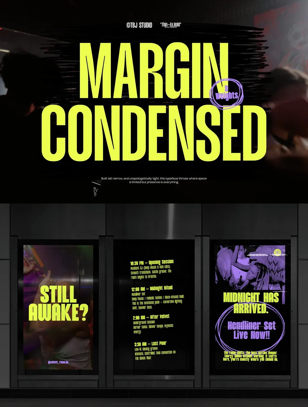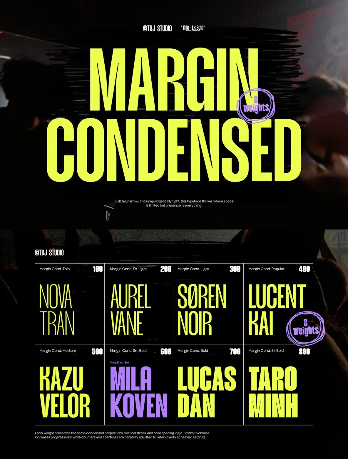 Engineered with a complete range of 8 weights from Thin to Extra Bold, TBJ Margin Condensed offers structured versatility across modern design needs. Each weight maintains structural consistency while gradually increasing visual strength, allowing designers to move seamlessly from refined narrow compositions to bold, dominant display typography—ideal for layered layouts and strong brand statements.