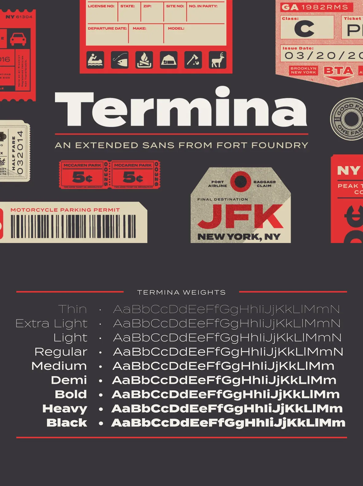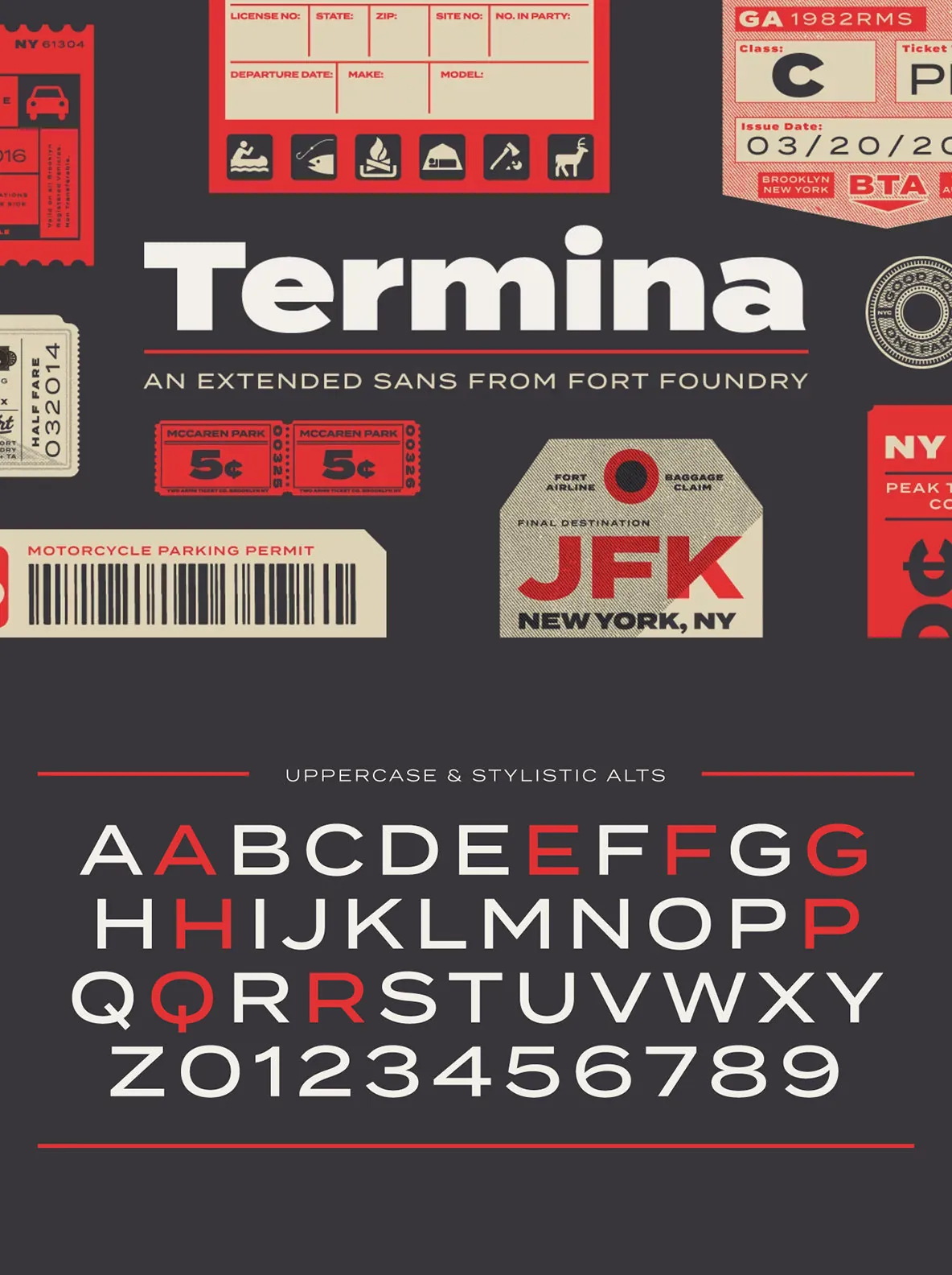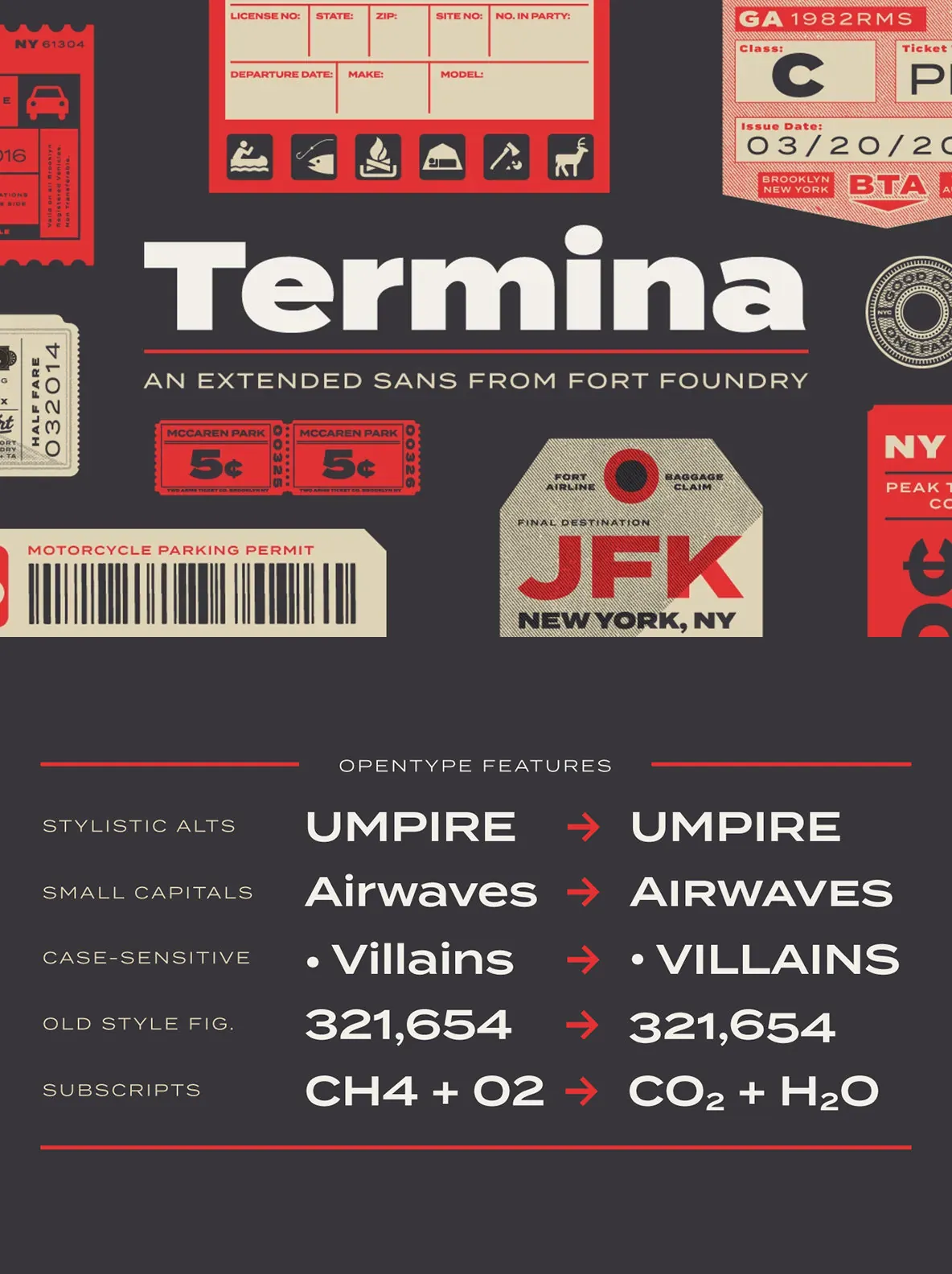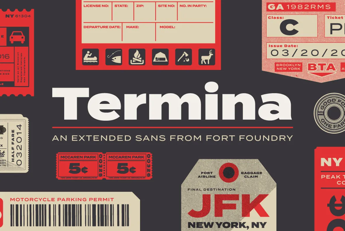 The various uses can range from advertising to logotype—from small descriptors to pull quotes. The family’s high x-height and wide letterforms help retain legibility and readability at smaller sizes. Opentype features include Stylistic Alternates, Small Capitals, Old Style Figures, Case-Sensitive Forms, and more. Clocking in at 743 glyphs, Termina includes a wide array of features and language support.