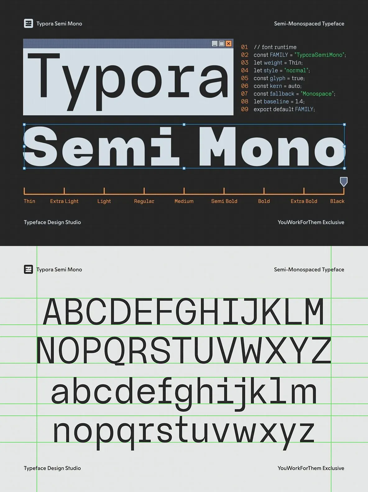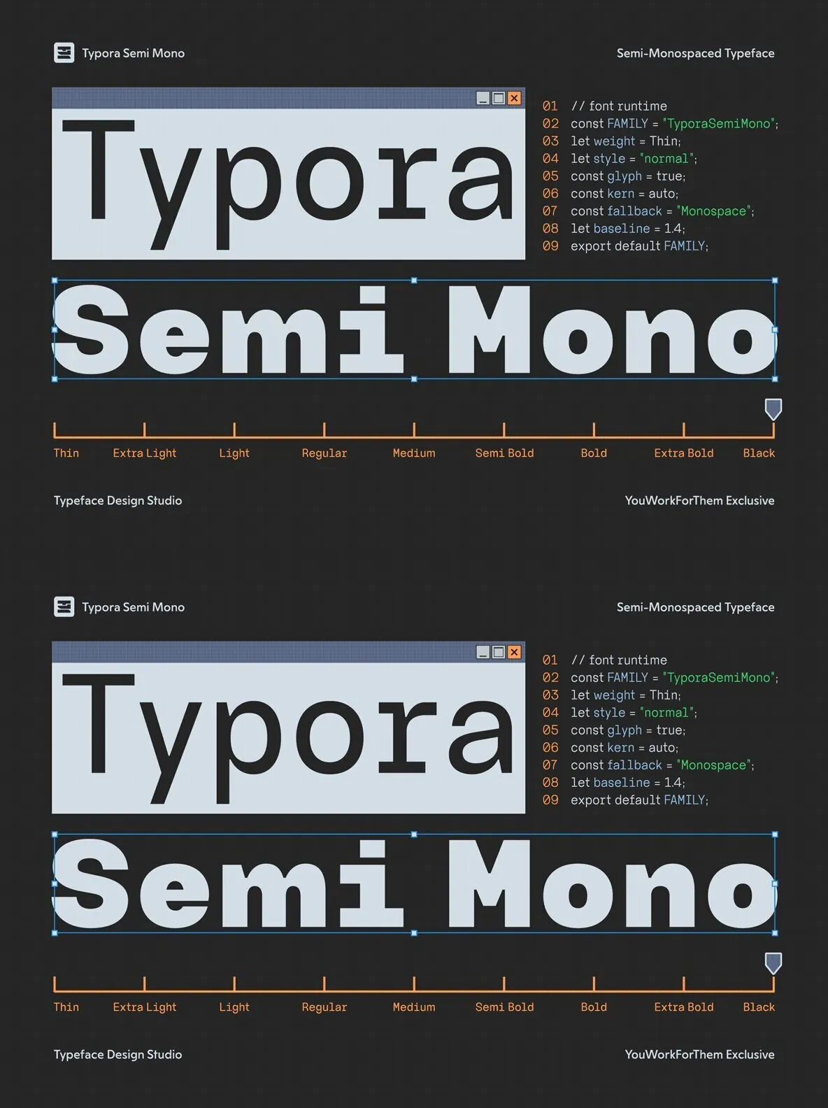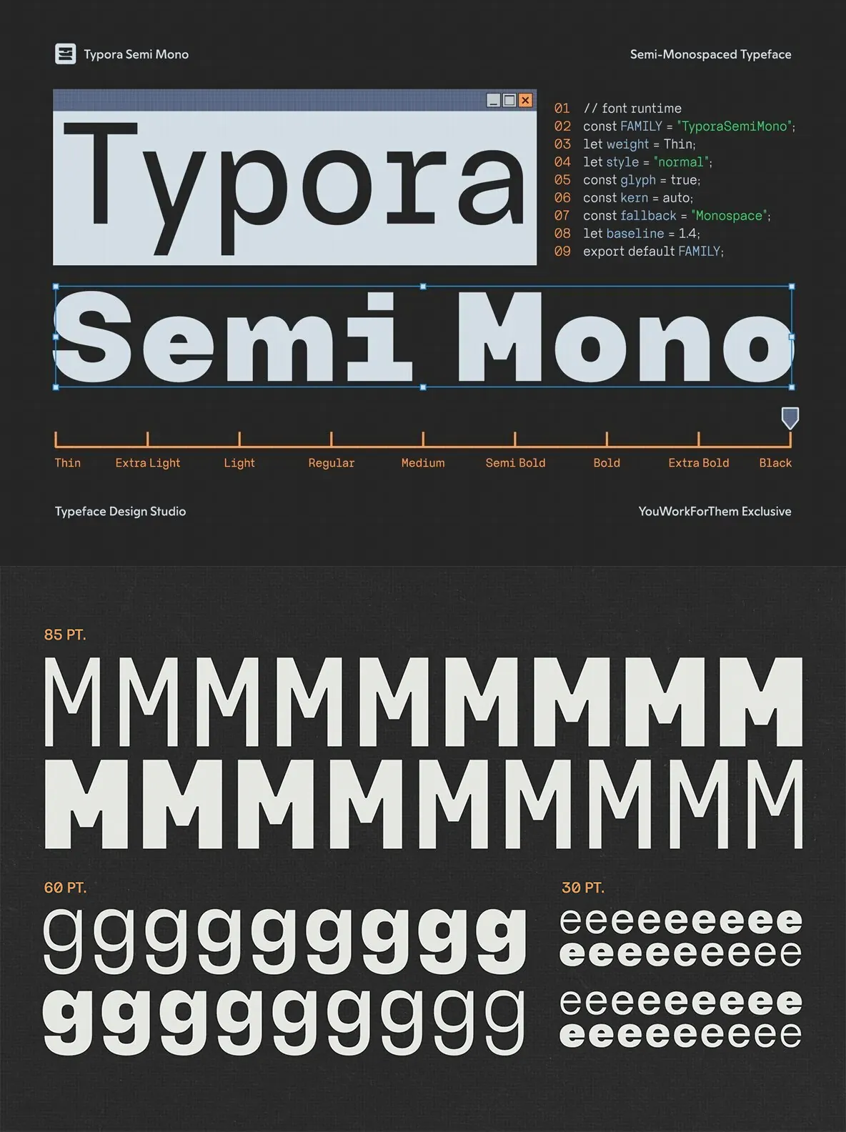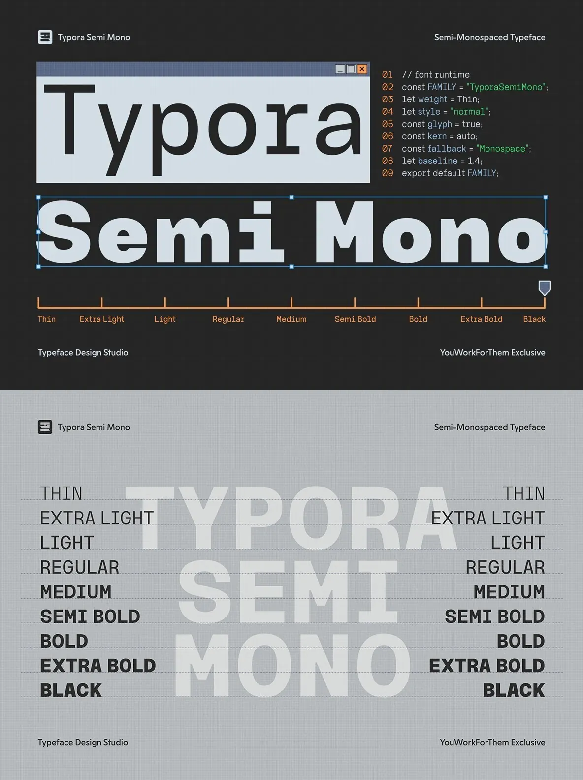 With nine meticulously developed weights from Thin to Black, Typora Semi Mono supports a broad spectrum of creative needs. Its versatility shines in UI/UX projects, code editors, editorial layouts, branding initiatives, and digital interfaces. The typeface’s blend of rigor and minimalism ensures reliable performance in both expressive and functional contexts, all while maintaining a sense of approachability and sophistication.