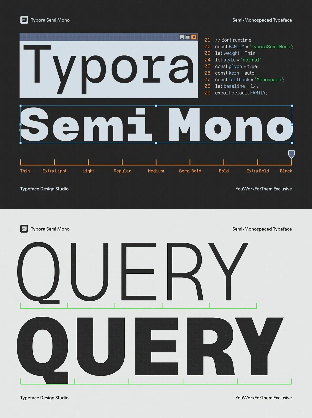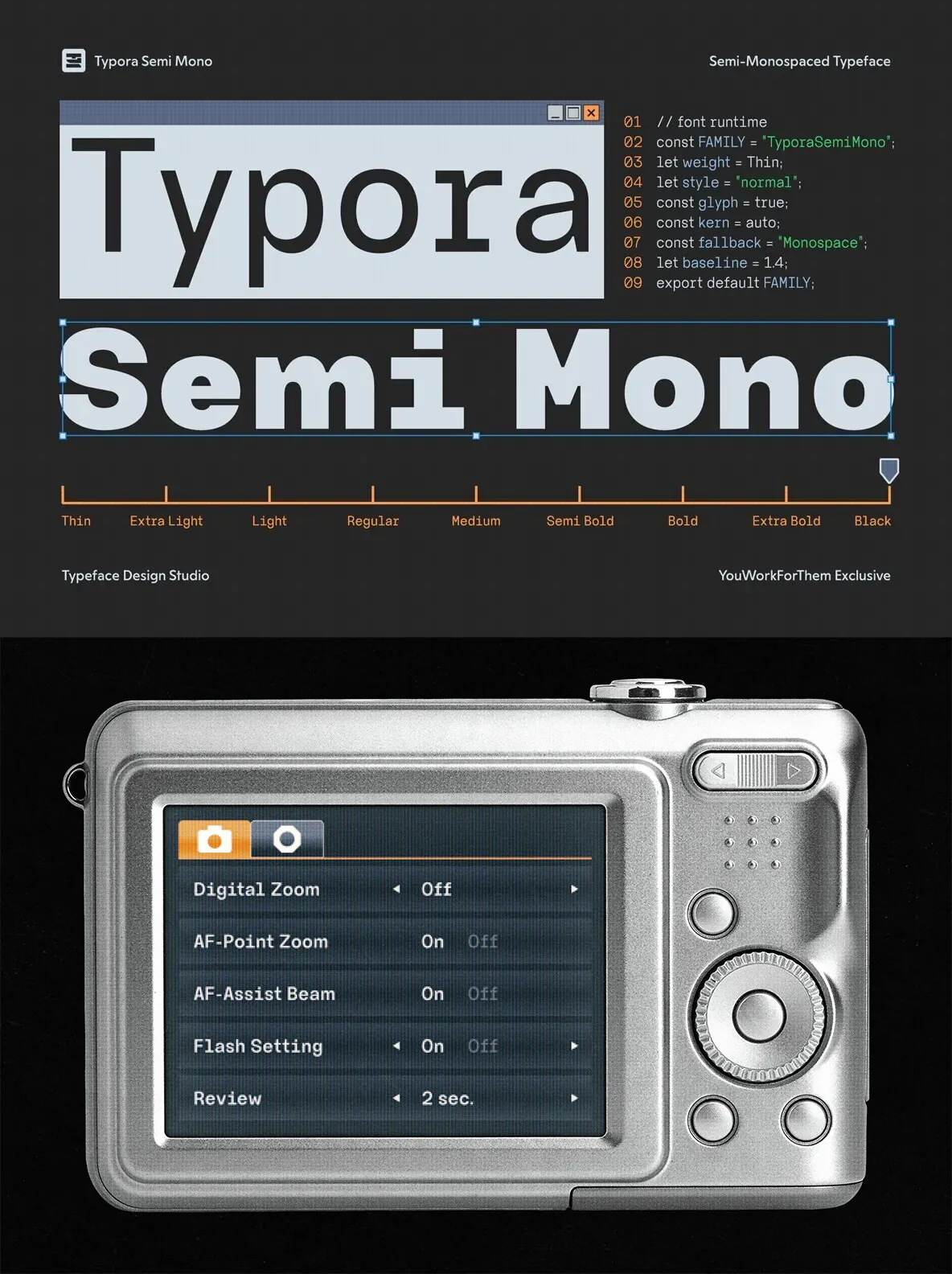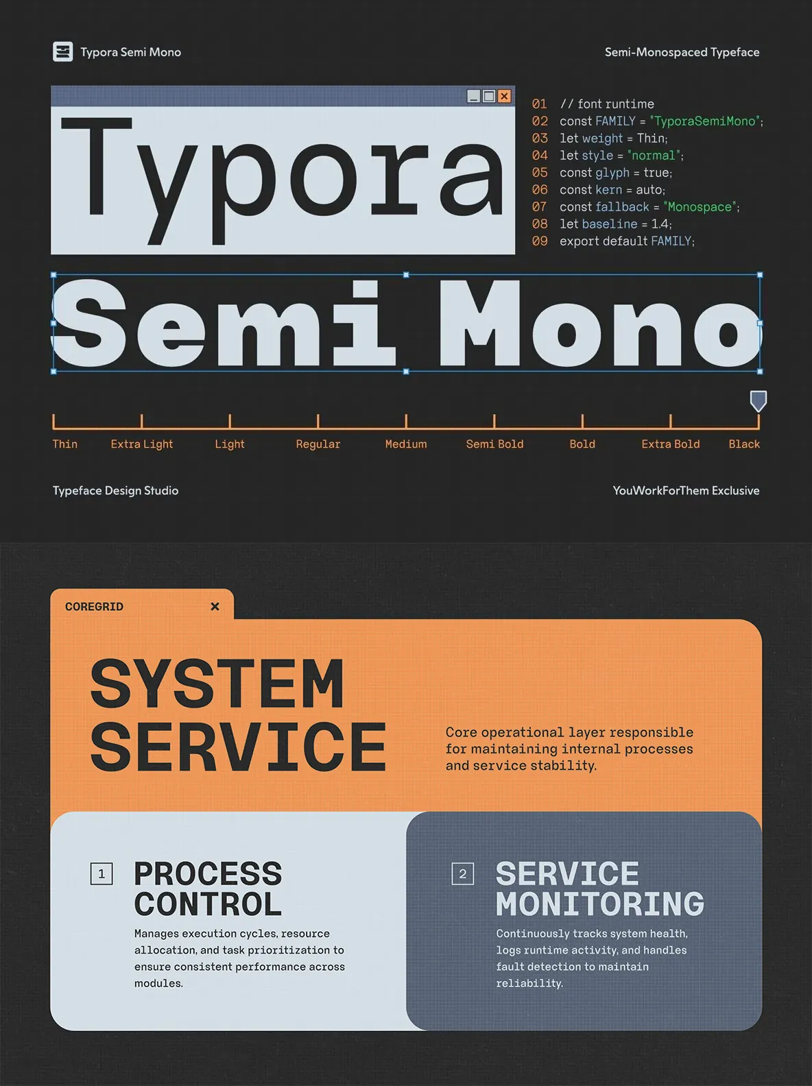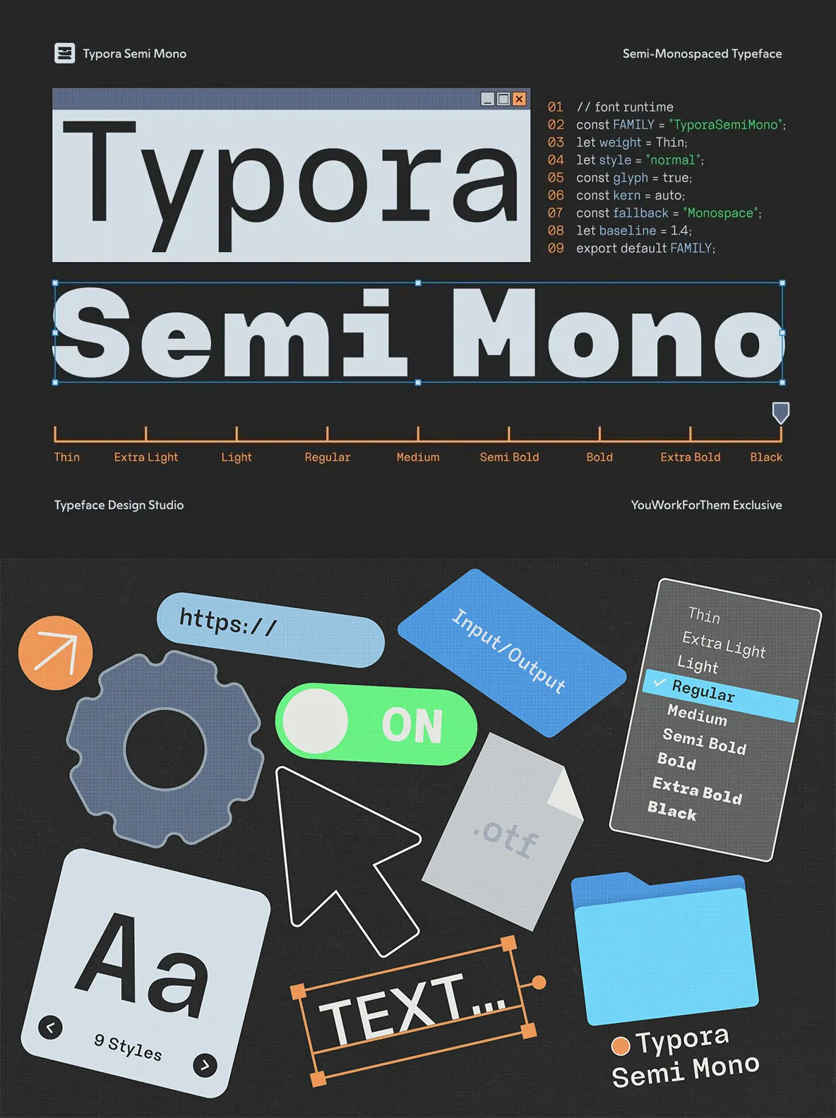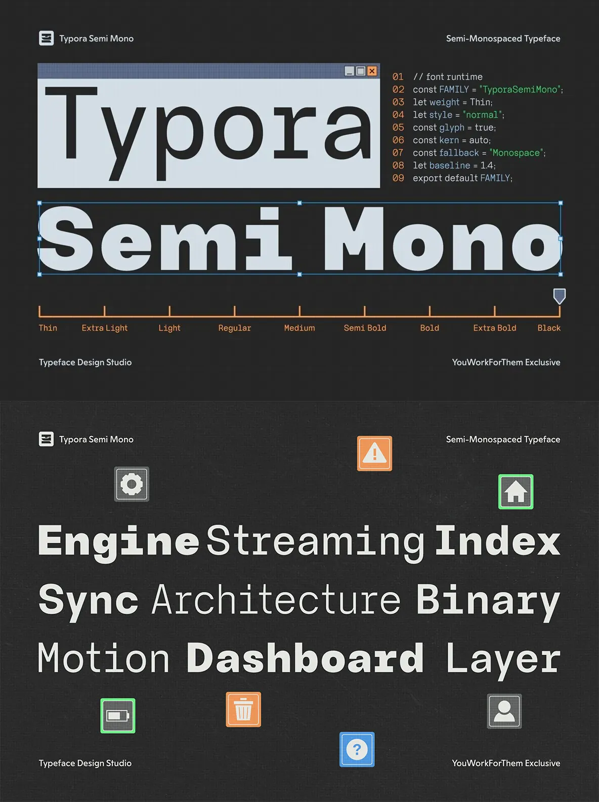 With nine meticulously developed weights from Thin to Black, Typora Semi Mono supports a broad spectrum of creative needs. Its versatility shines in UI/UX projects, code editors, editorial layouts, branding initiatives, and digital interfaces. The typeface’s blend of rigor and minimalism ensures reliable performance in both expressive and functional contexts, all while maintaining a sense of approachability and sophistication.