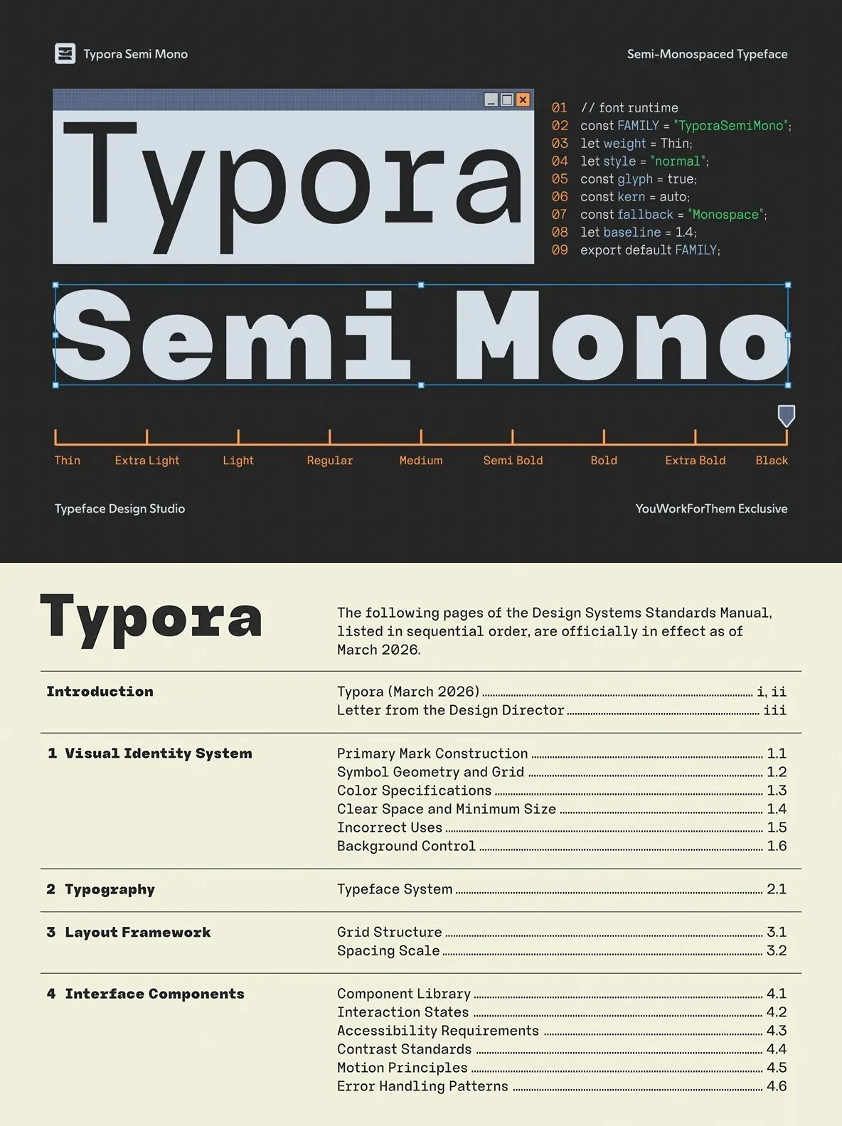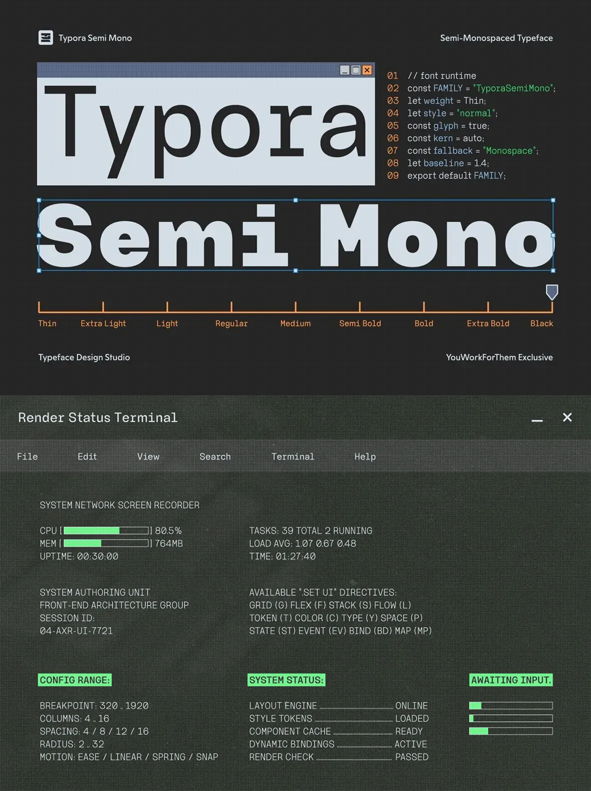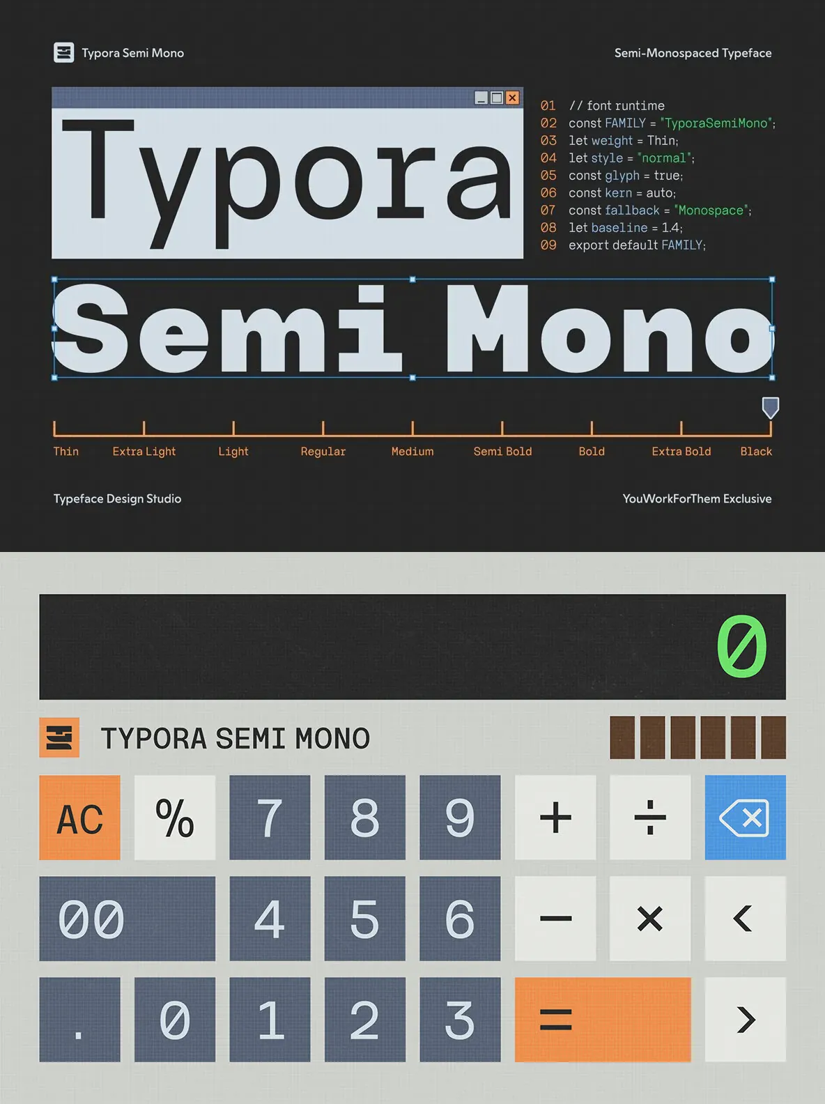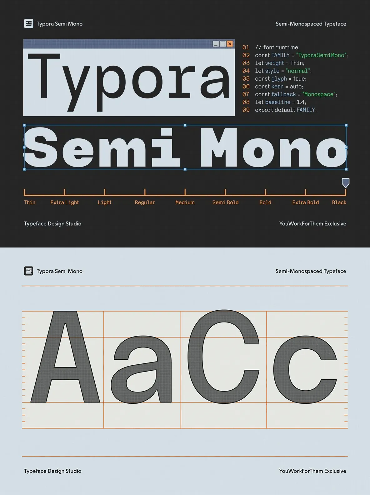 With nine meticulously developed weights from Thin to Black, Typora Semi Mono supports a broad spectrum of creative needs. Its versatility shines in UI/UX projects, code editors, editorial layouts, branding initiatives, and digital interfaces. The typeface’s blend of rigor and minimalism ensures reliable performance in both expressive and functional contexts, all while maintaining a sense of approachability and sophistication.