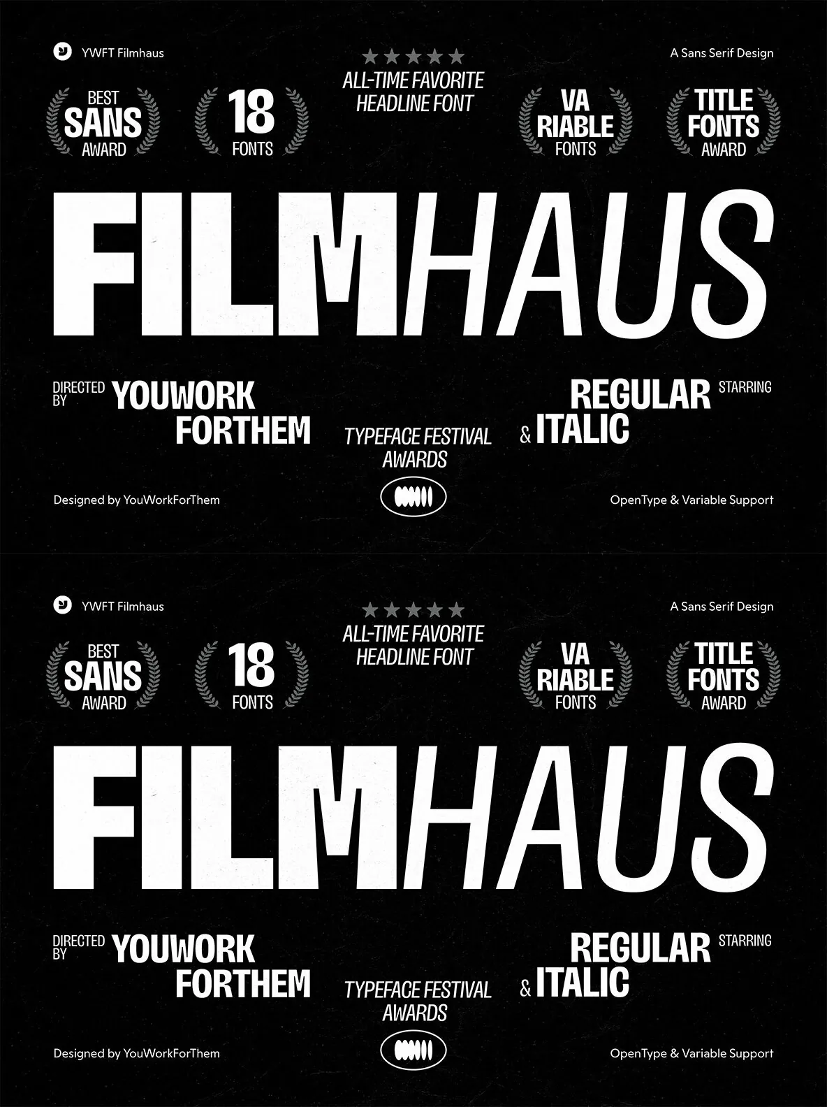 YWFT Filmhaus is a condensed sans-serif typeface designed for projects where space and impact converge. Perfect for YouTube thumbnails, TikTok reels, vertical stories, cinematic posters, and any format requiring a distinct headline, Filmhaus blends clean geometry with a high x-height for clarity on both large and compact screens. Its visual strength meets the needs of digital-first designers seeking both presence and efficiency.