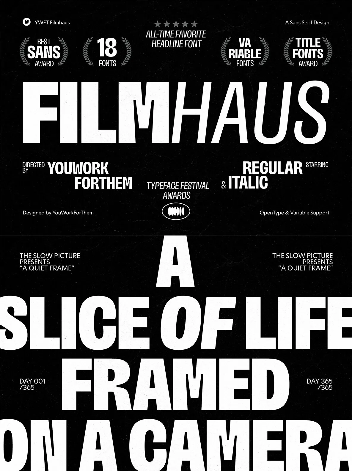 Filmhaus extends beyond a simple headline font. Its family comprises nine precise weights with corresponding italics, totaling eighteen options for broad creative application. A variable font version provides responsive typographic control, serving brand identities, editorial compositions, and UI design with adaptability and performance.