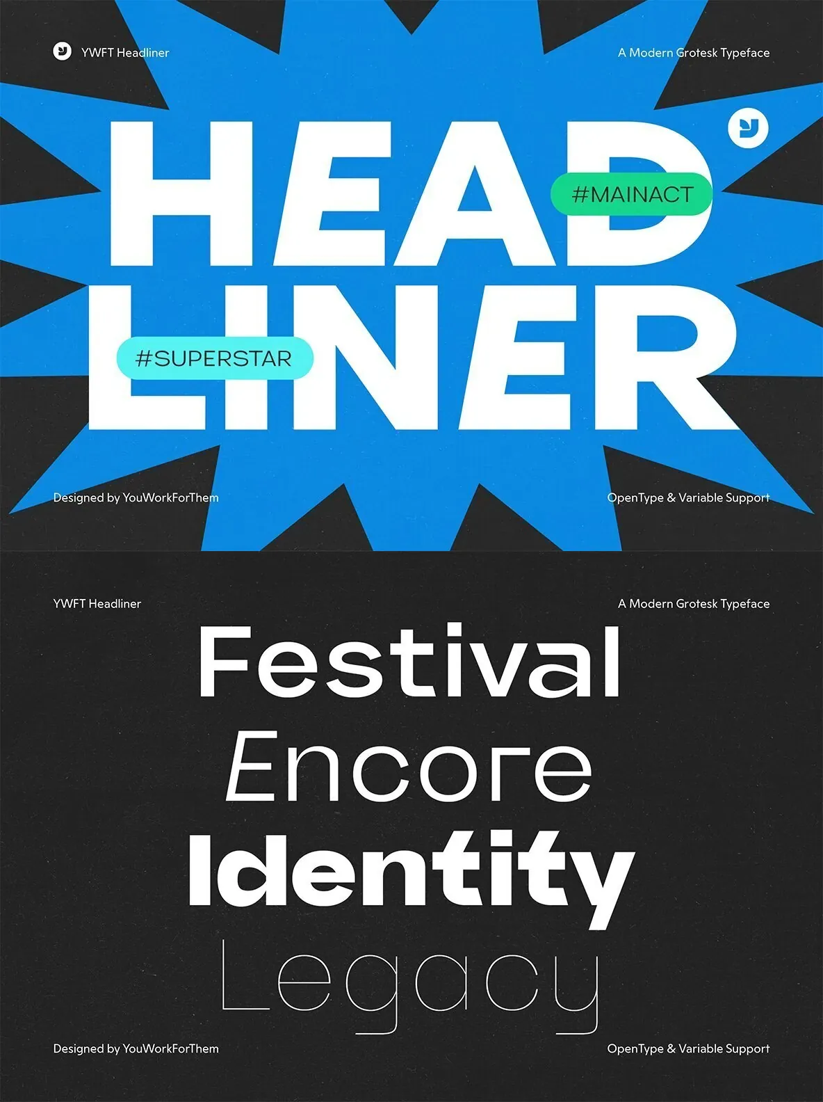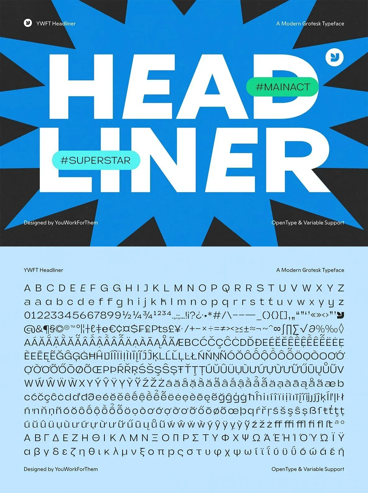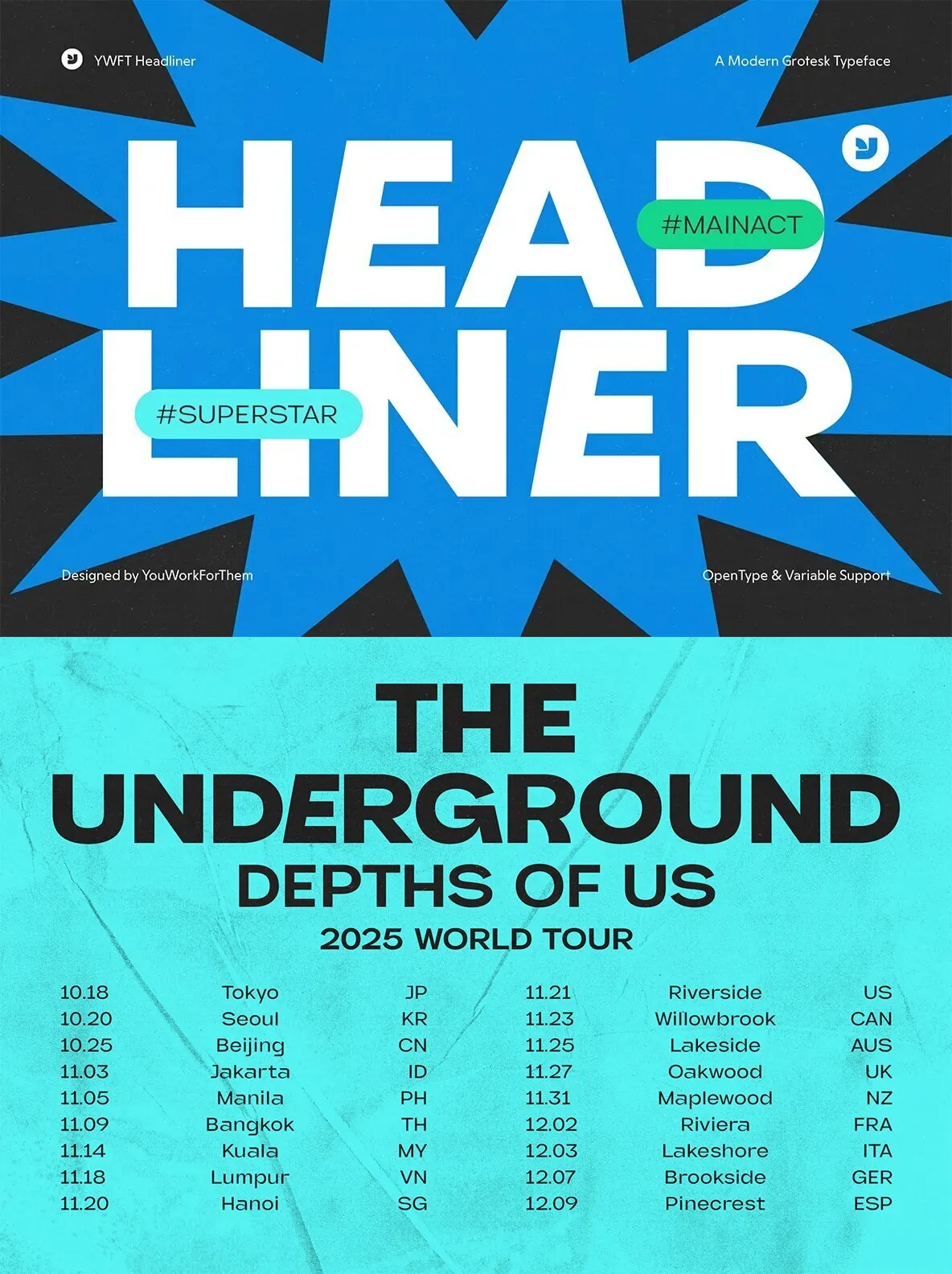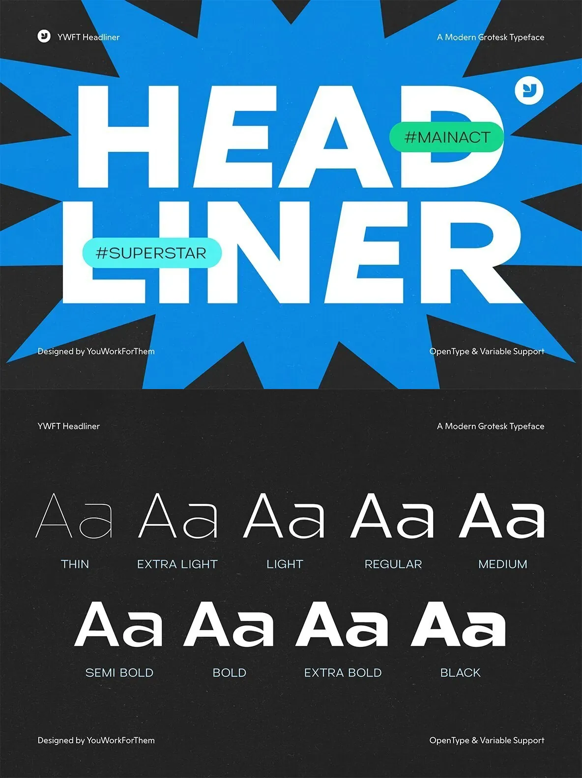 YWFT Headliner is the grotesque sans-serif at the core of YouWorkForThem’s own identity. Designed in-house, it draws from the visual language of classic event typography while staying practical for digital-first work. Nine weights run from hairline-thin to full Black, with a variable font that spans the entire range in a single file. The 2026 update brings the most significant refinements since its release: redrawn letterforms on key characters including S, a, O, g, b, d, c, and C, a near-complete kerning rework across all weights, improved spacing with particular attention to the lighter cuts, and over 40 new glyphs. Curve quality is up while node count is down by as much as 40%.