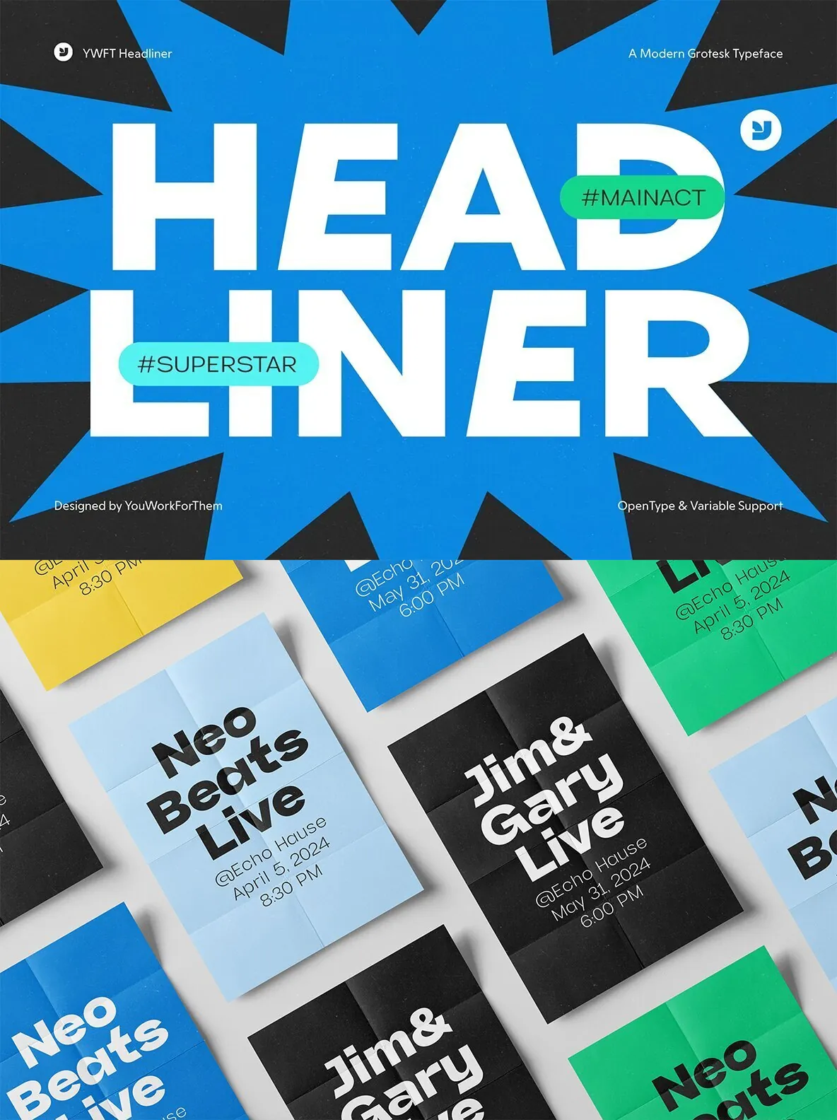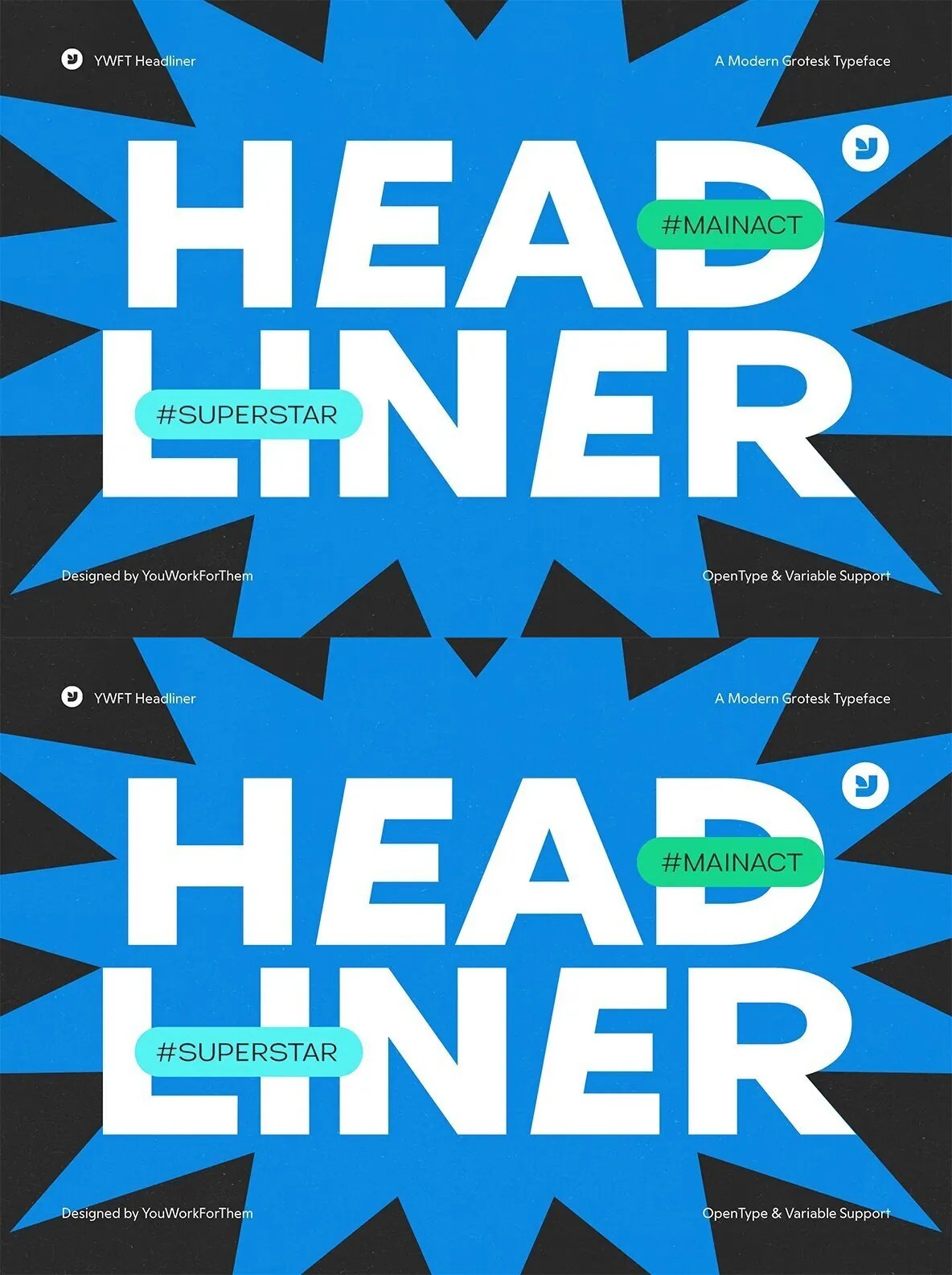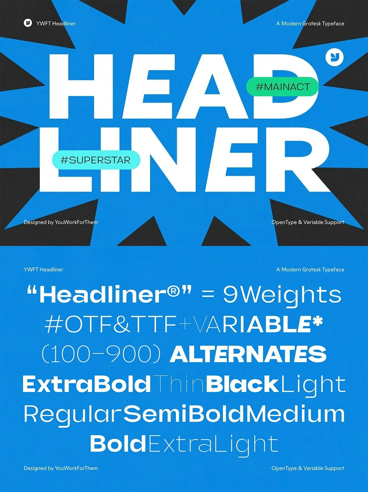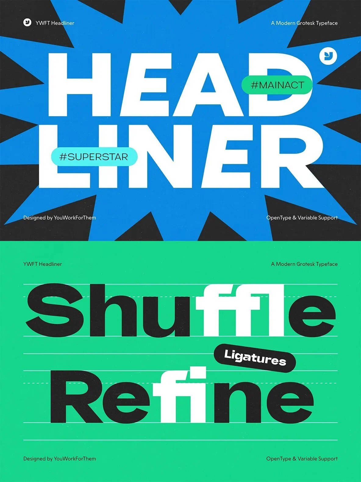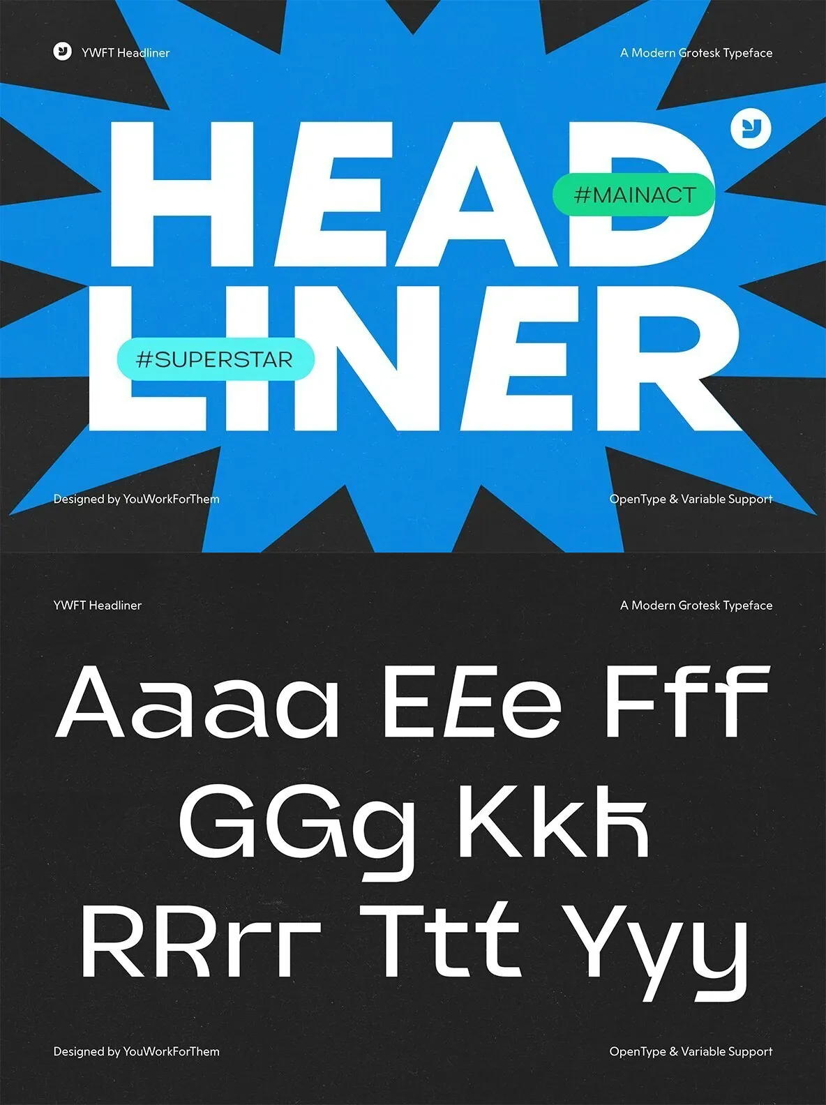YWFT Headliner is the grotesque sans-serif at the core of YouWorkForThem’s own identity. Designed in-house, it draws from the visual language of classic event typography while staying practical for digital-first work. Nine weights run from hairline-thin to full Black, with a variable font that spans the entire range in a single file. The 2026 update brings the most significant refinements since its release: redrawn letterforms on key characters including S, a, O, g, b, d, c, and C, a near-complete kerning rework across all weights, improved spacing with particular attention to the lighter cuts, and over 40 new glyphs. Curve quality is up while node count is down by as much as 40%.