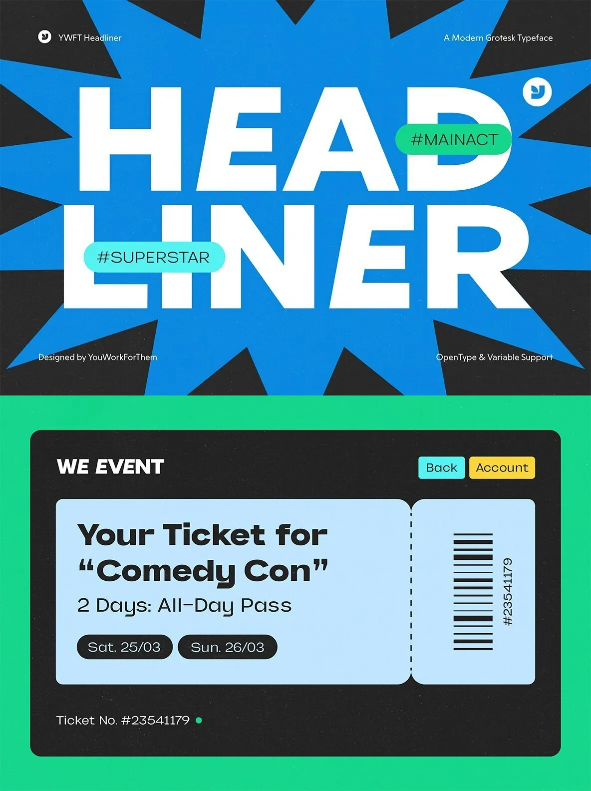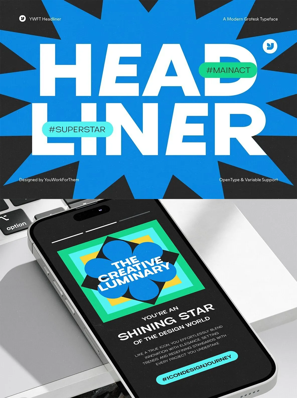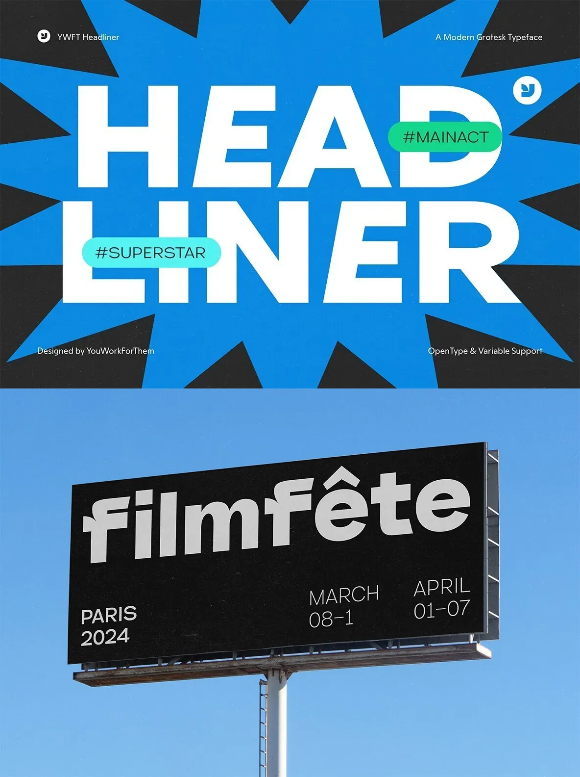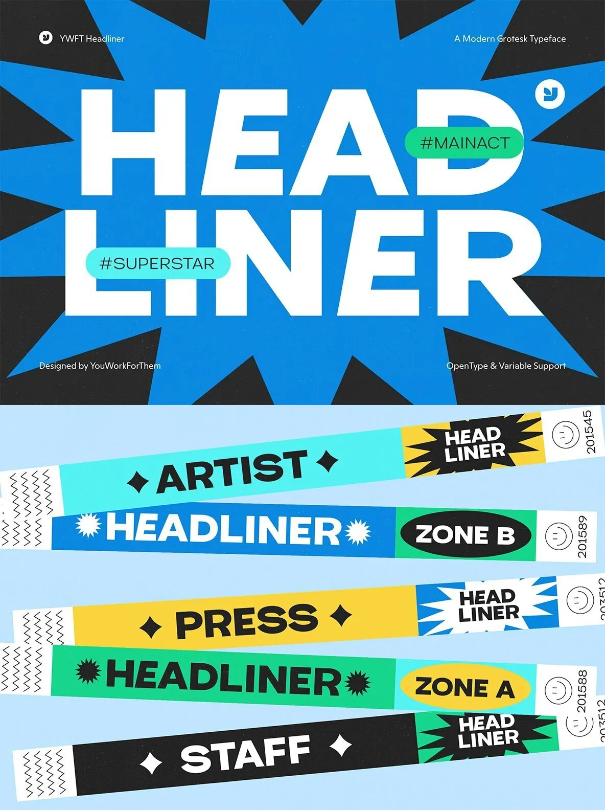 YWFT Headliner is the grotesque sans-serif at the core of YouWorkForThem’s own identity. Designed in-house, it draws from the visual language of classic event typography while staying practical for digital-first work. Nine weights run from hairline-thin to full Black, with a variable font that spans the entire range in a single file. The 2026 update brings the most significant refinements since its release: redrawn letterforms on key characters including S, a, O, g, b, d, c, and C, a near-complete kerning rework across all weights, improved spacing with particular attention to the lighter cuts, and over 40 new glyphs. Curve quality is up while node count is down by as much as 40%.