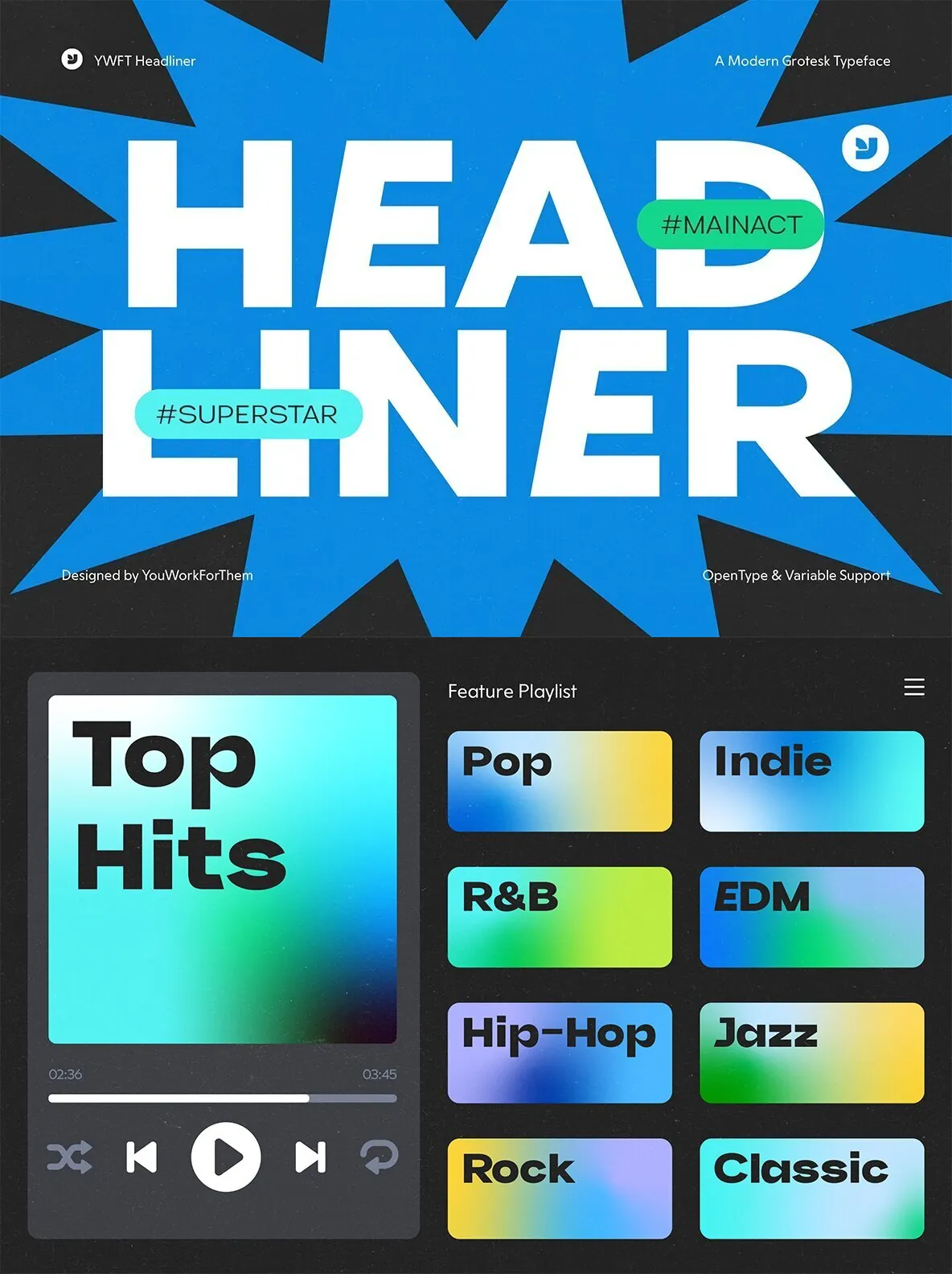 Headliner sits in the grotesque tradition — think the warmth of Aktiv Grotesk or the approachability of Proxima Nova — but with more personality at large sizes and very unique alternate options. The letterforms carry subtle quirks that read as neutral at text sizes and expressive at display scale. It’s wider and more open than geometric grotesques like Futura, and has more personalty than the bland design of Helvetica. That middle ground is what makes it adaptable: it can anchor a bold festival poster just as naturally as a clean SaaS interface. The weight range earns its breadth too — the lighter cuts are genuinely delicate, while Black holds its own at billboard scale. It performs best in headlines, logotype work, event branding, editorial layouts, and UI contexts where the type needs to carry visual weight without feeling aggressive.